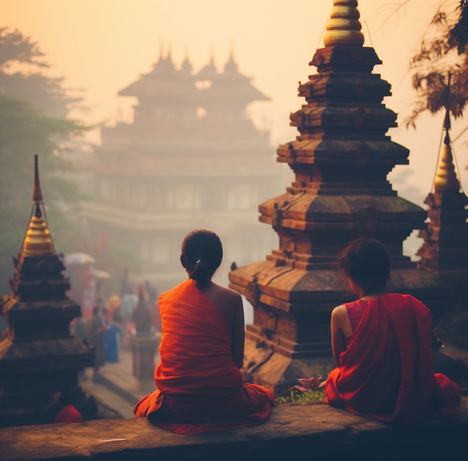 Two monks in orange robes sit in meditation at a temple, surrounded by mist and ancient architecture, creating a serene atmosphere.