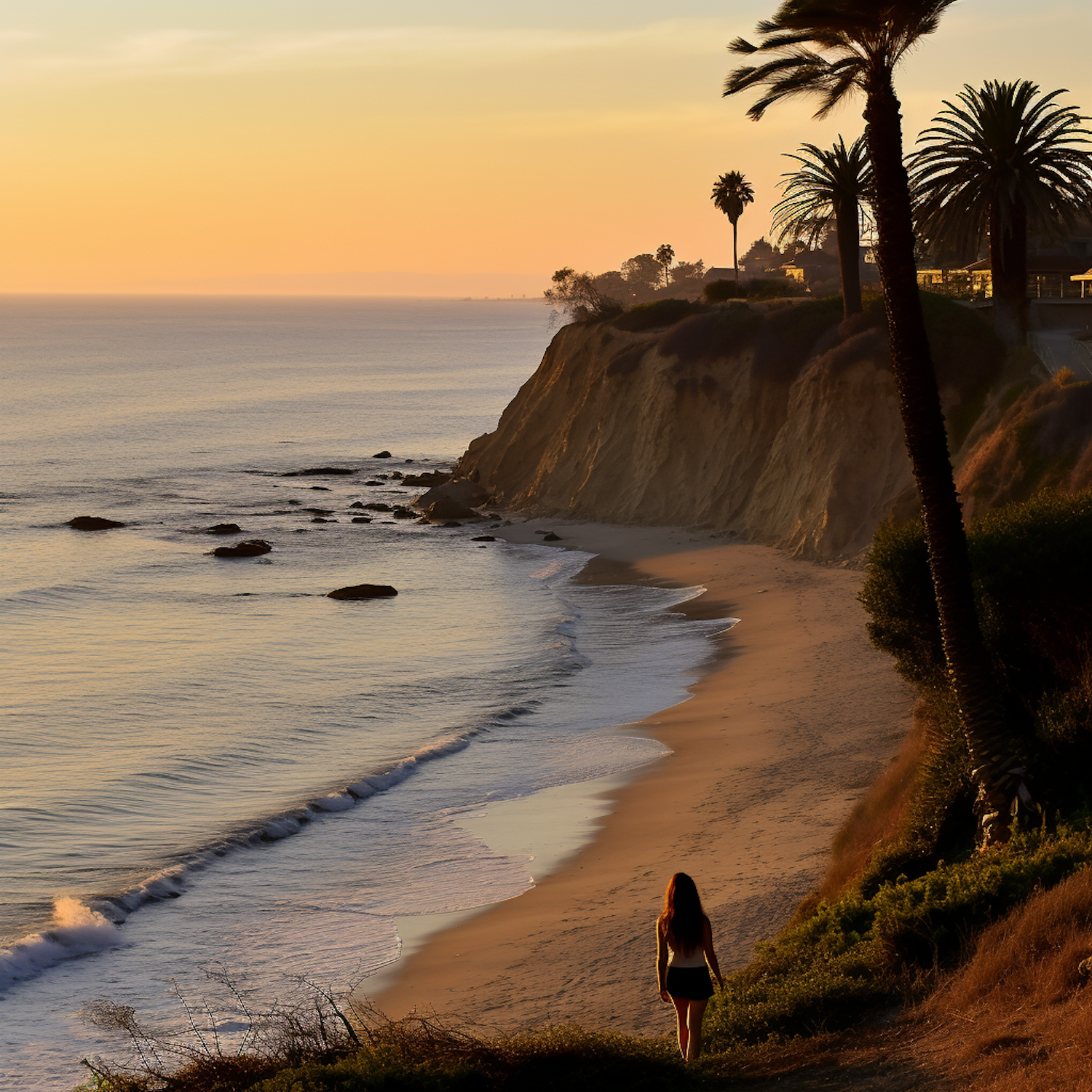 Woman walks along a serene beach at sunset, with palm trees and cliffs in the background, creating a tranquil coastal scene.
