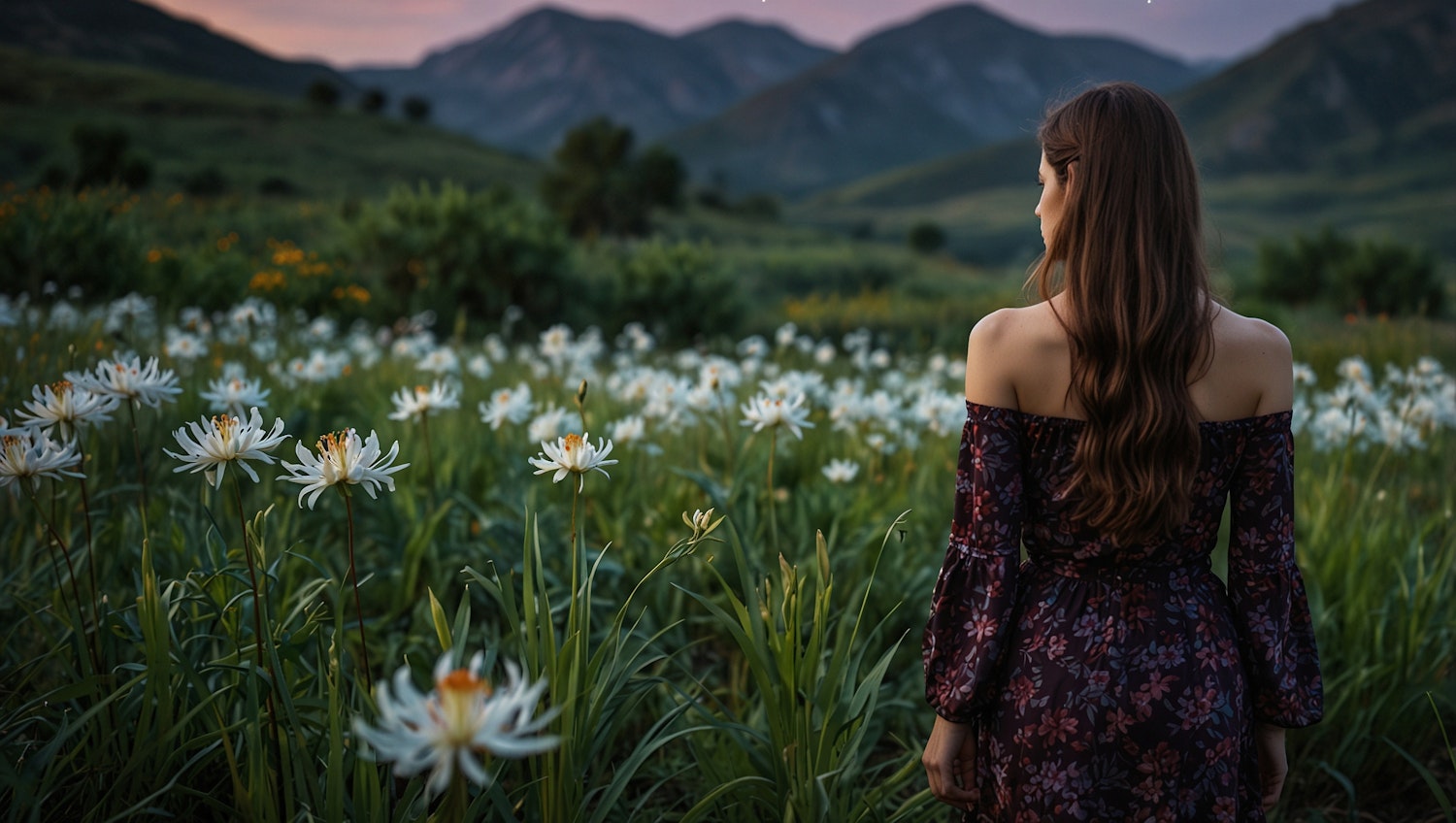 Woman in floral dress stands in a field of white flowers, with mountains in the background under a dusky sky.