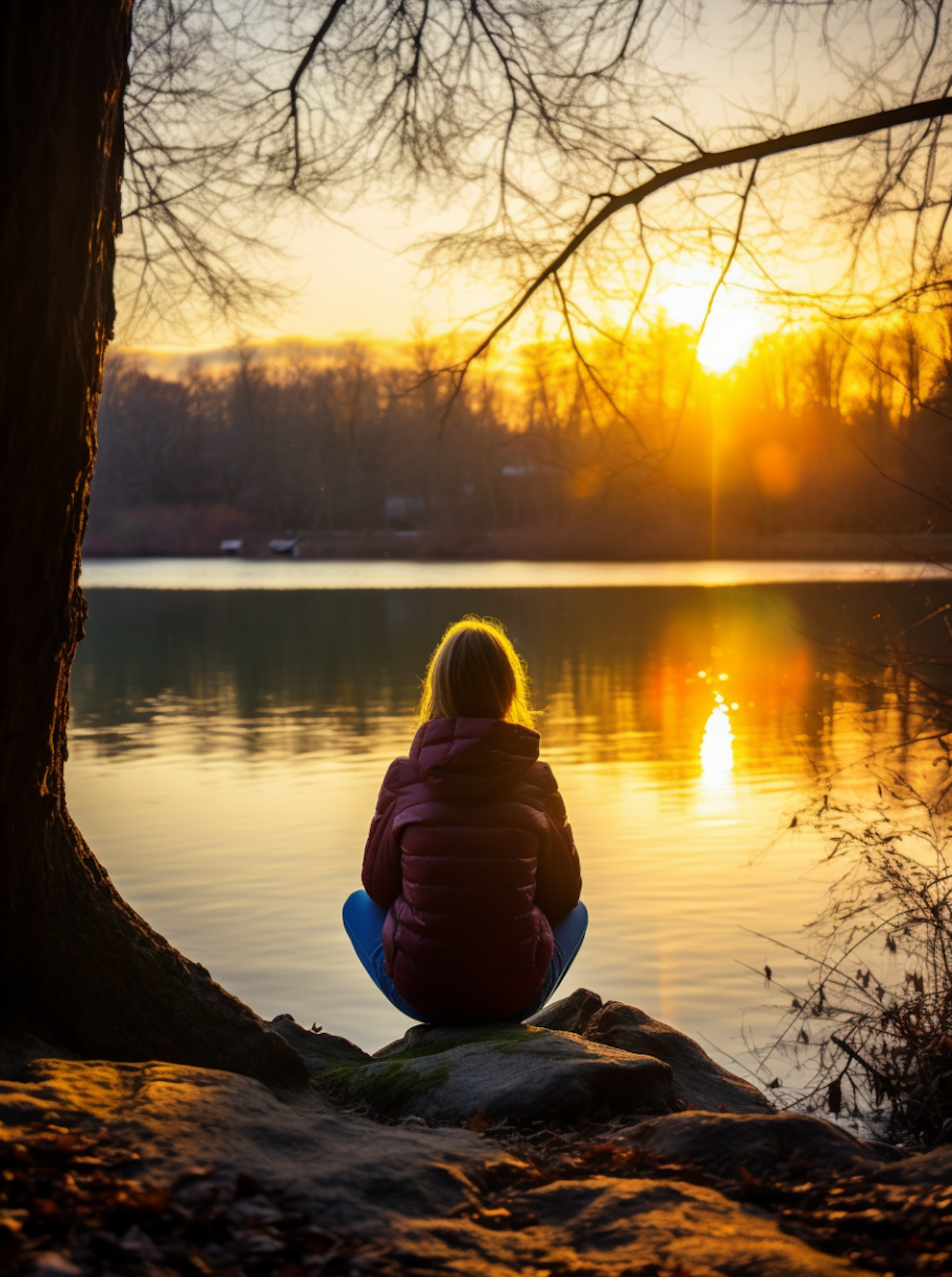 Person in maroon jacket sits by a lake at sunset, surrounded by bare trees and golden reflections on the water.