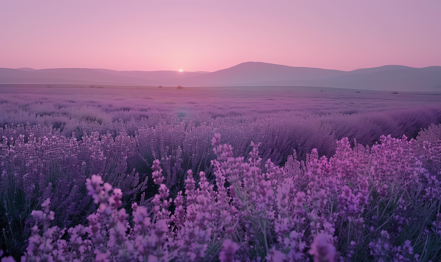 Serene lavender field at sunset with pink and purple hues, creating a tranquil and picturesque landscape.
