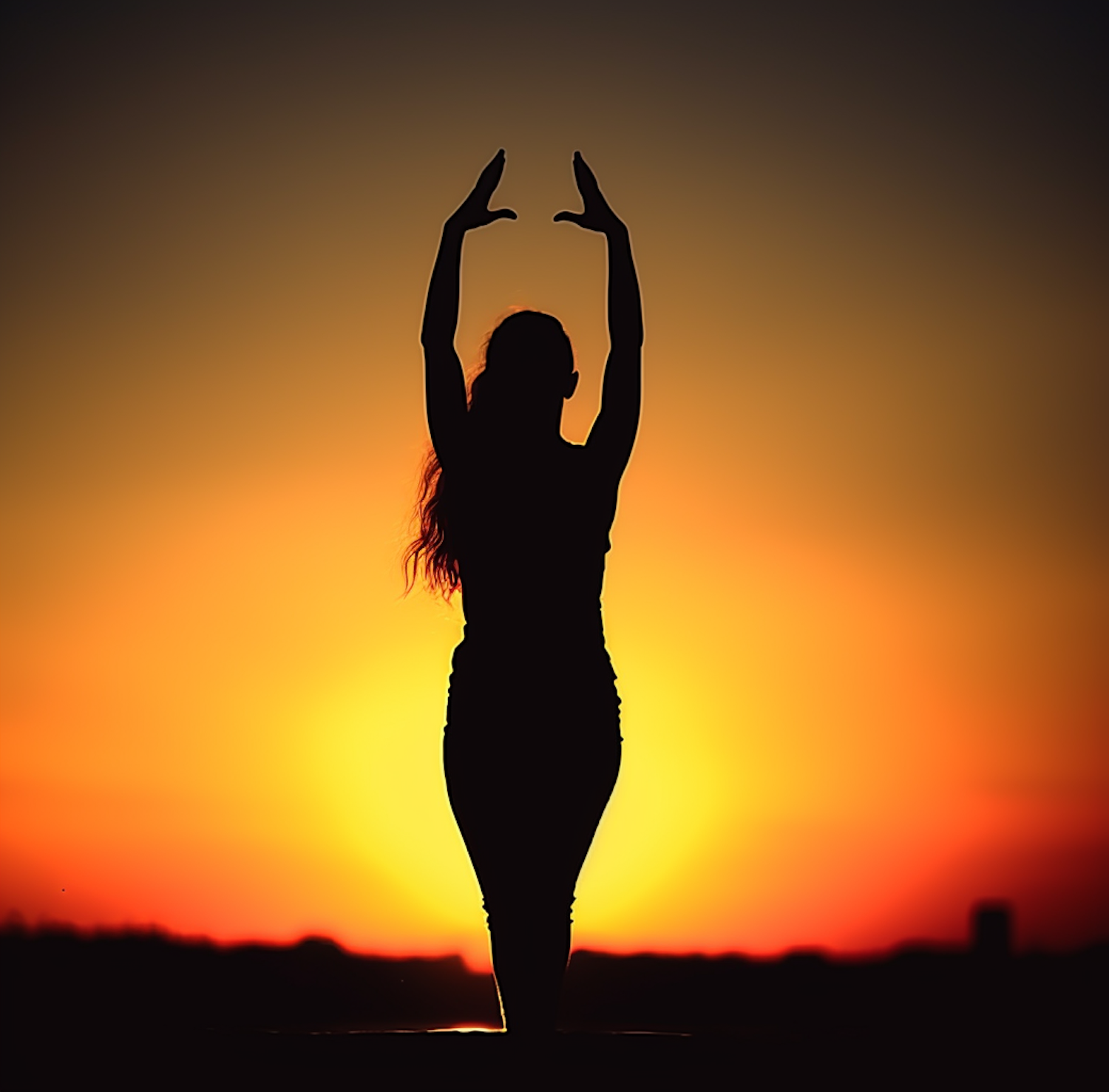 Silhouette of a person with raised arms against a vibrant sunset, creating a striking contrast with the colorful sky.