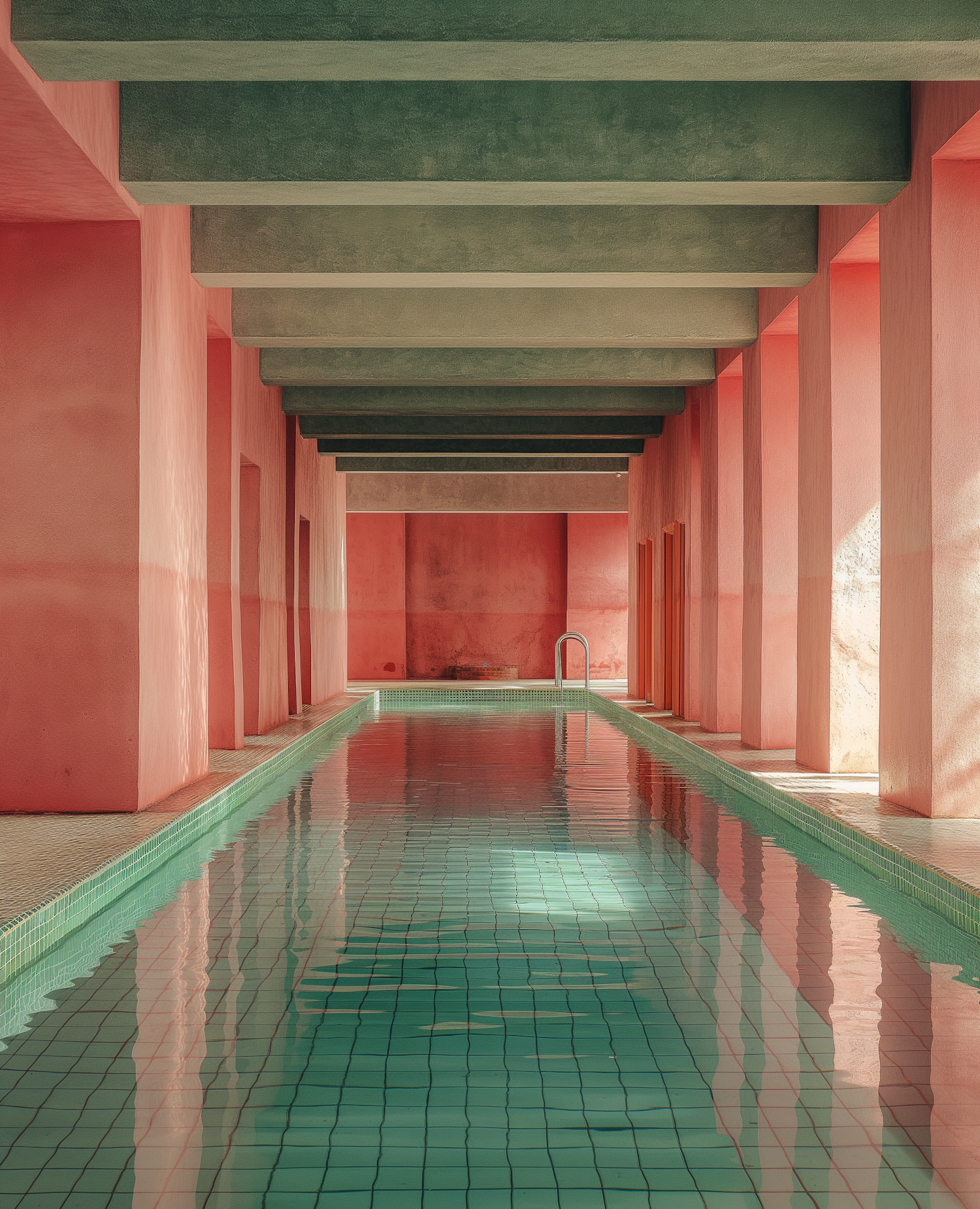 A serene indoor pool with pink walls and green beams, reflecting a modern minimalist design. Sunlight enhances the vibrant colors.