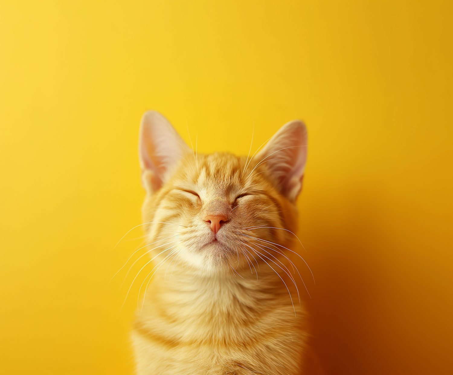 Ginger tabby cat with closed eyes against a vibrant yellow background, exuding calm and contentment.