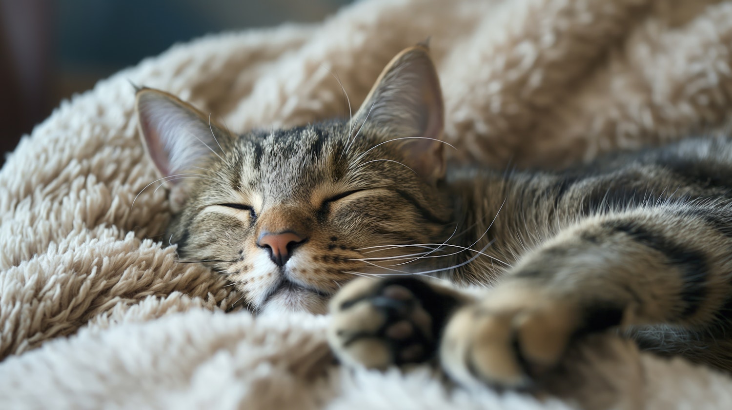 A tabby cat peacefully sleeps on a fluffy cream blanket, exuding warmth and tranquility.
