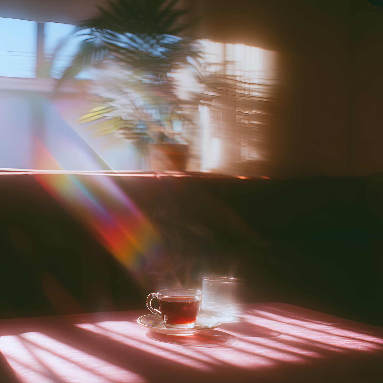 A steaming cup of tea and a glass of water on a sunlit table, with soft light and a potted plant in the background creating a serene ambiance.