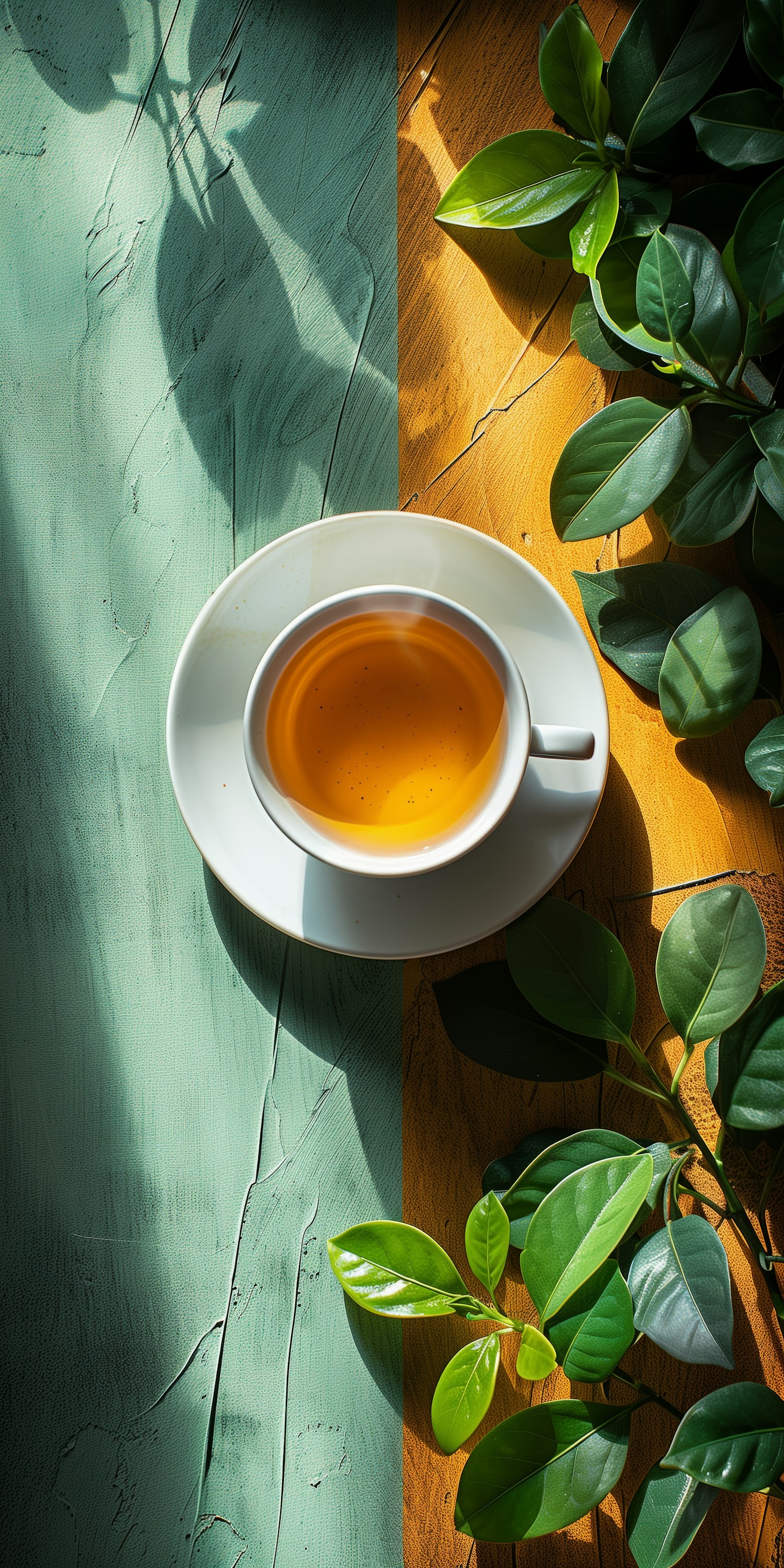 A cup of tea on a textured surface with green and orange hues, surrounded by lush leaves and dynamic shadows.