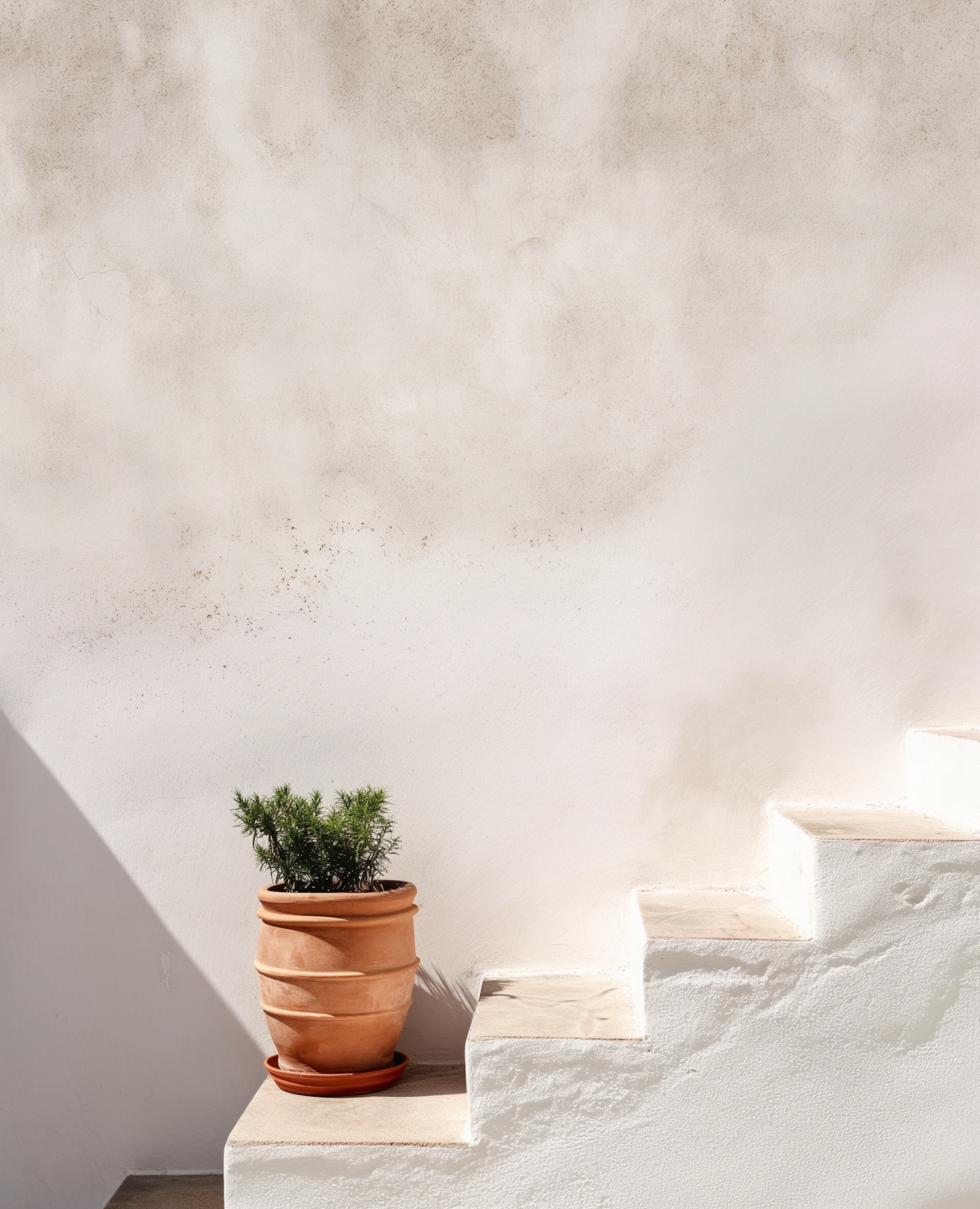 Minimalist scene with a terracotta pot on white steps against a textured cream wall, bathed in warm sunlight.