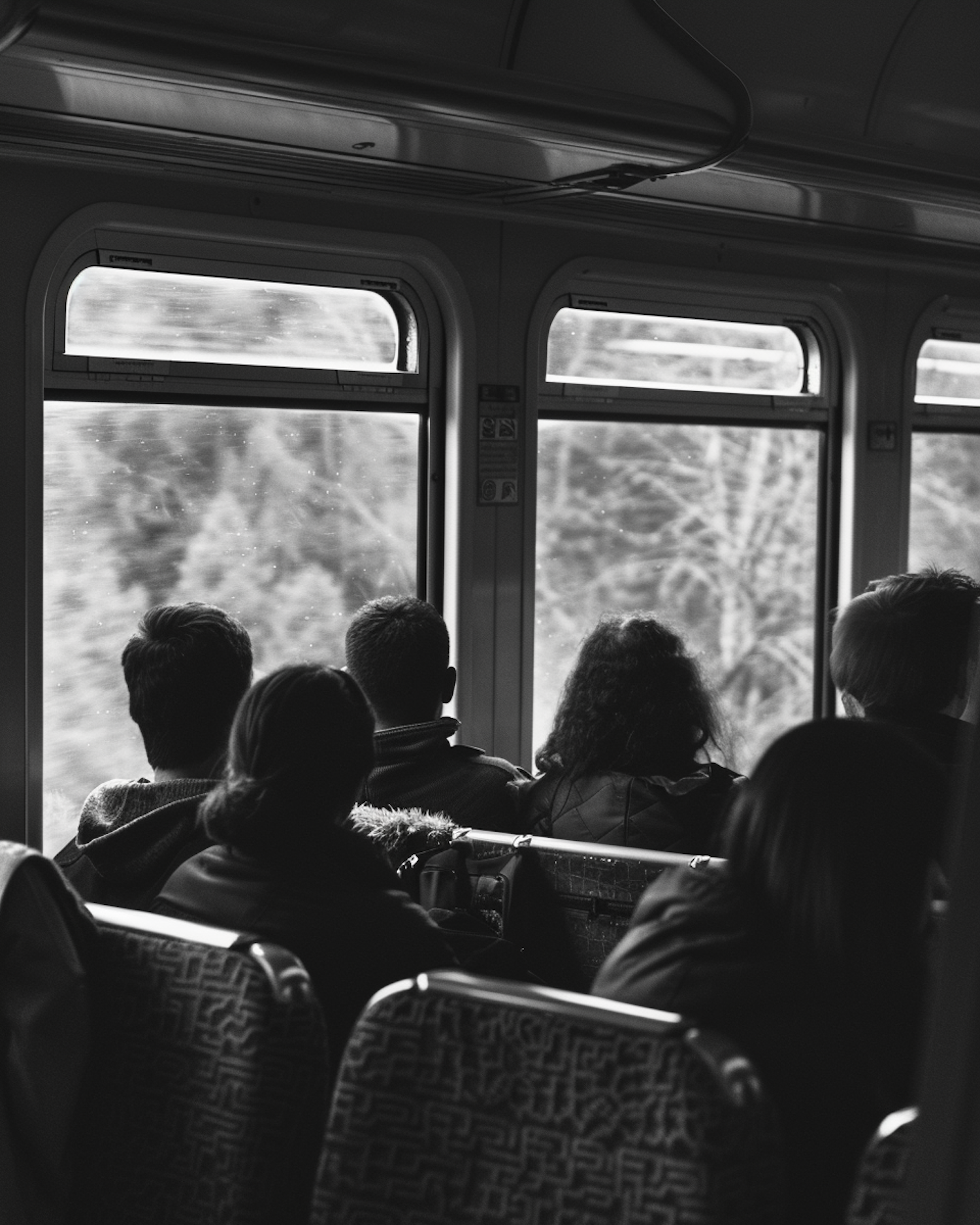 Black-and-white photo of train passengers gazing out windows at blurred trees, evoking a serene and introspective travel mood.