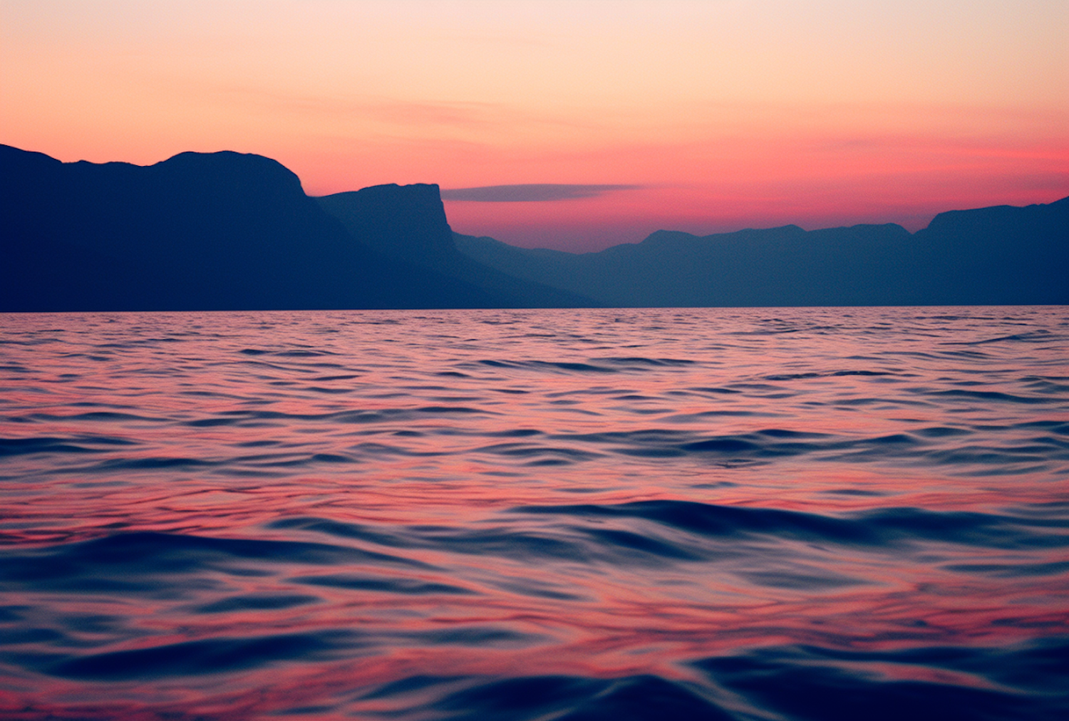 Serene ocean sunset with vibrant pink and orange hues reflecting on gentle waves, silhouetted by distant mountains.