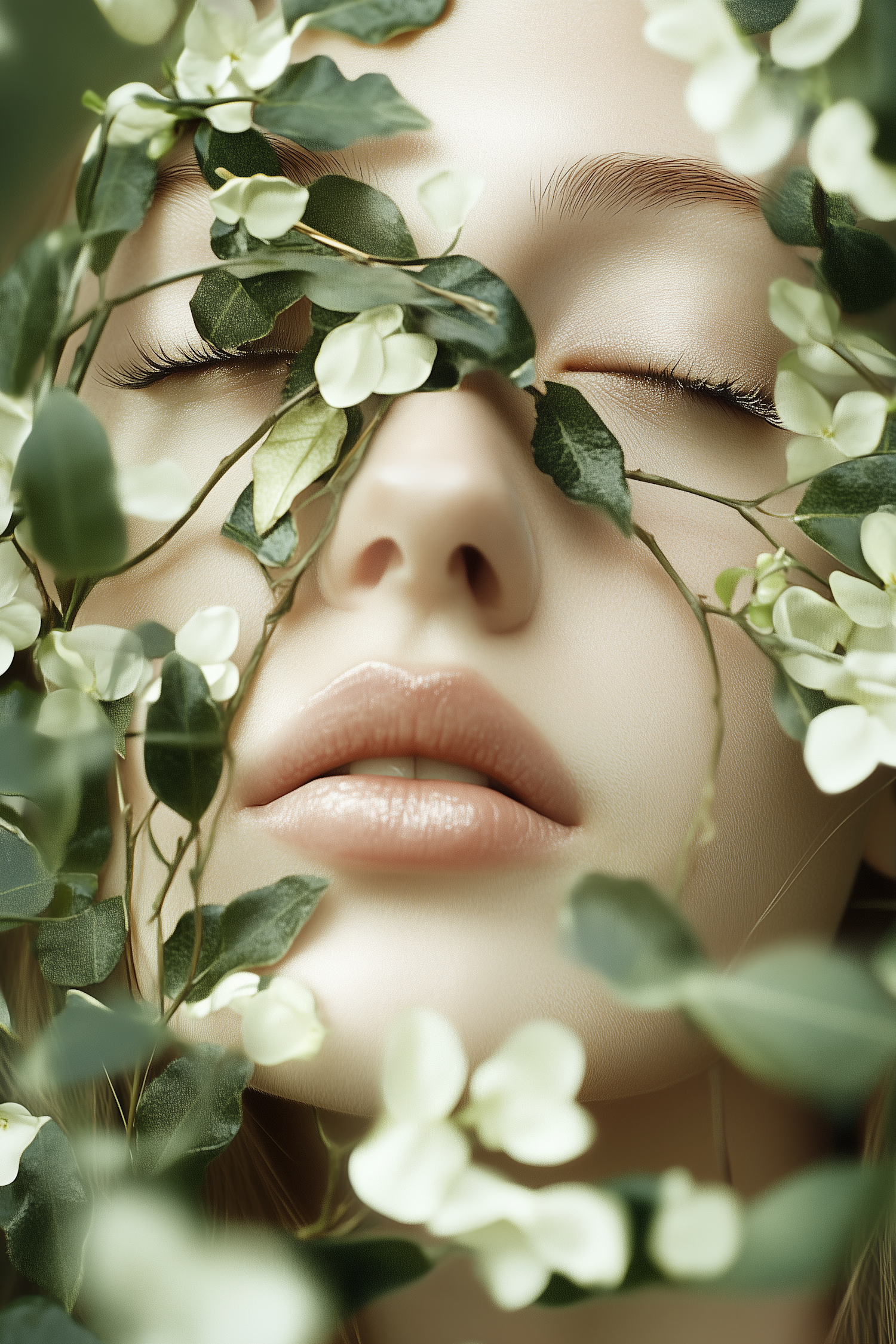 Serene close-up of a woman's face surrounded by lush green leaves and white flowers, exuding tranquility and natural beauty.