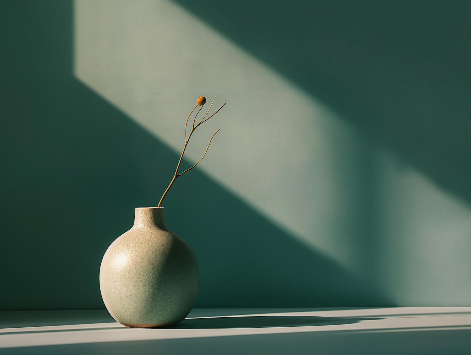 Minimalist green vase with a dried flower, casting shadows in angled sunlight against a green wall. Elegant and serene composition.
