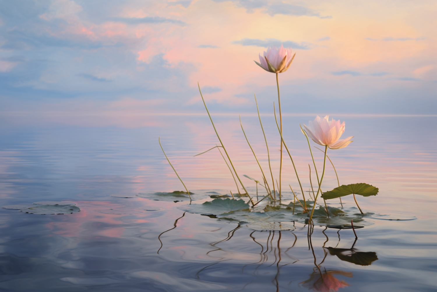 Serene water scene with pink lotus flowers and pastel sky reflections, creating a tranquil and peaceful atmosphere.