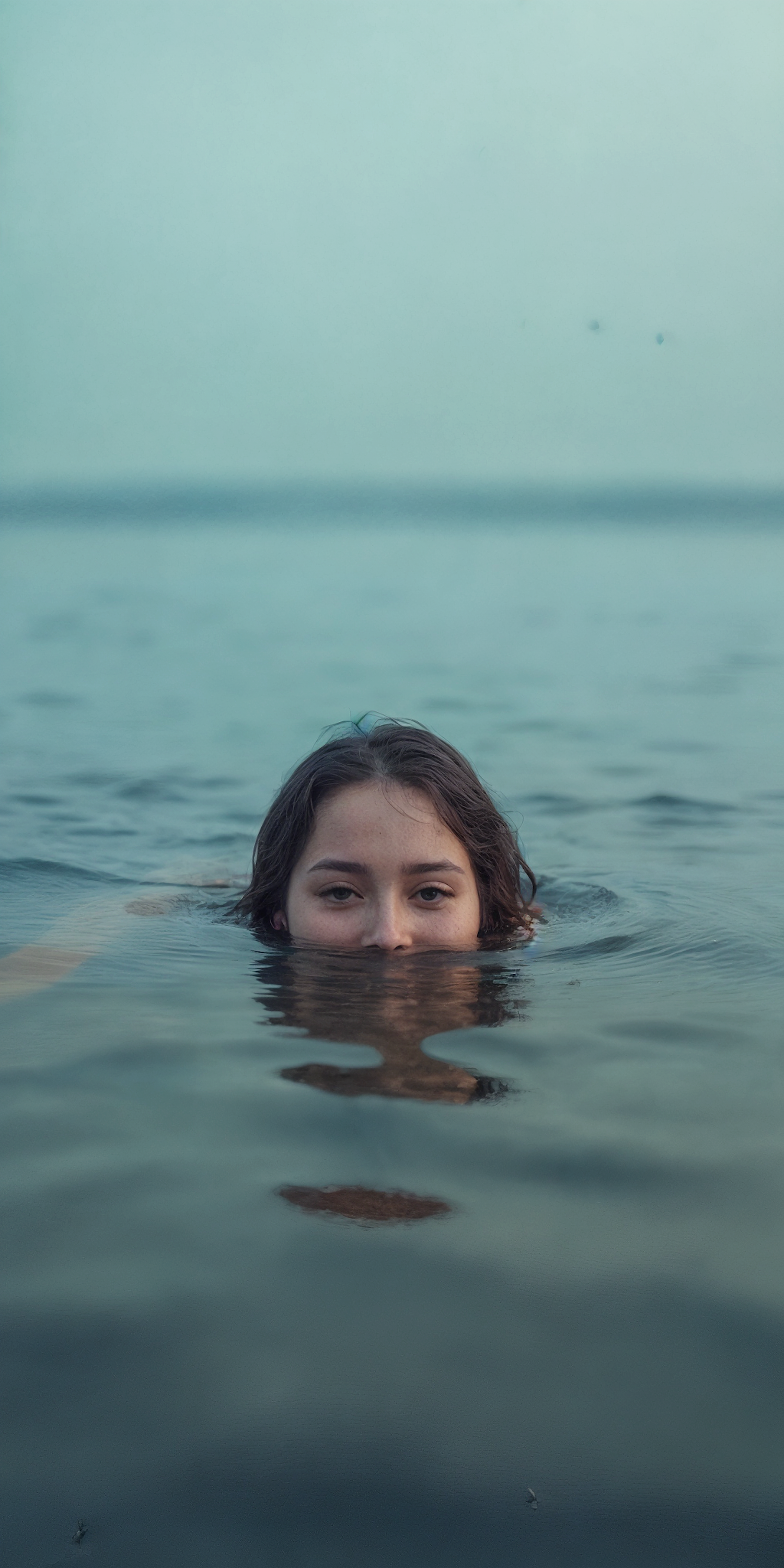 A person with short dark hair gazes from calm water, their face partially submerged, creating a serene and introspective scene.