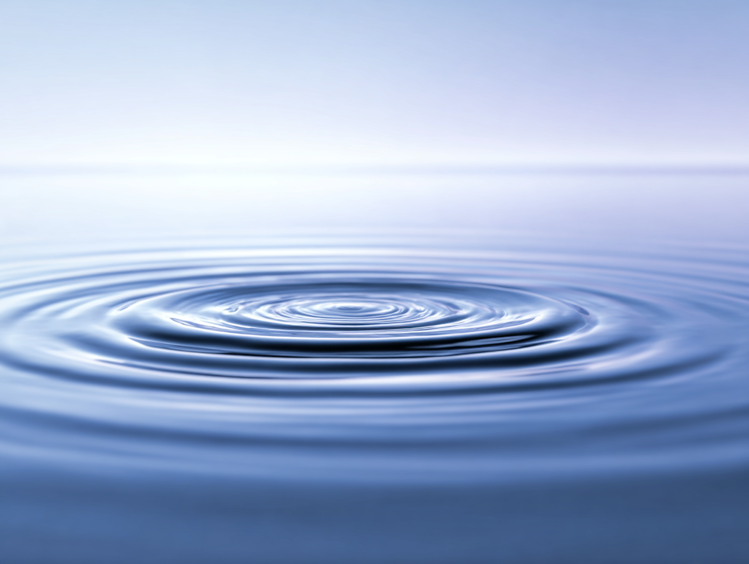 A tranquil image of ripples on a calm water surface, with a soft blue gradient sky reflecting on the water.