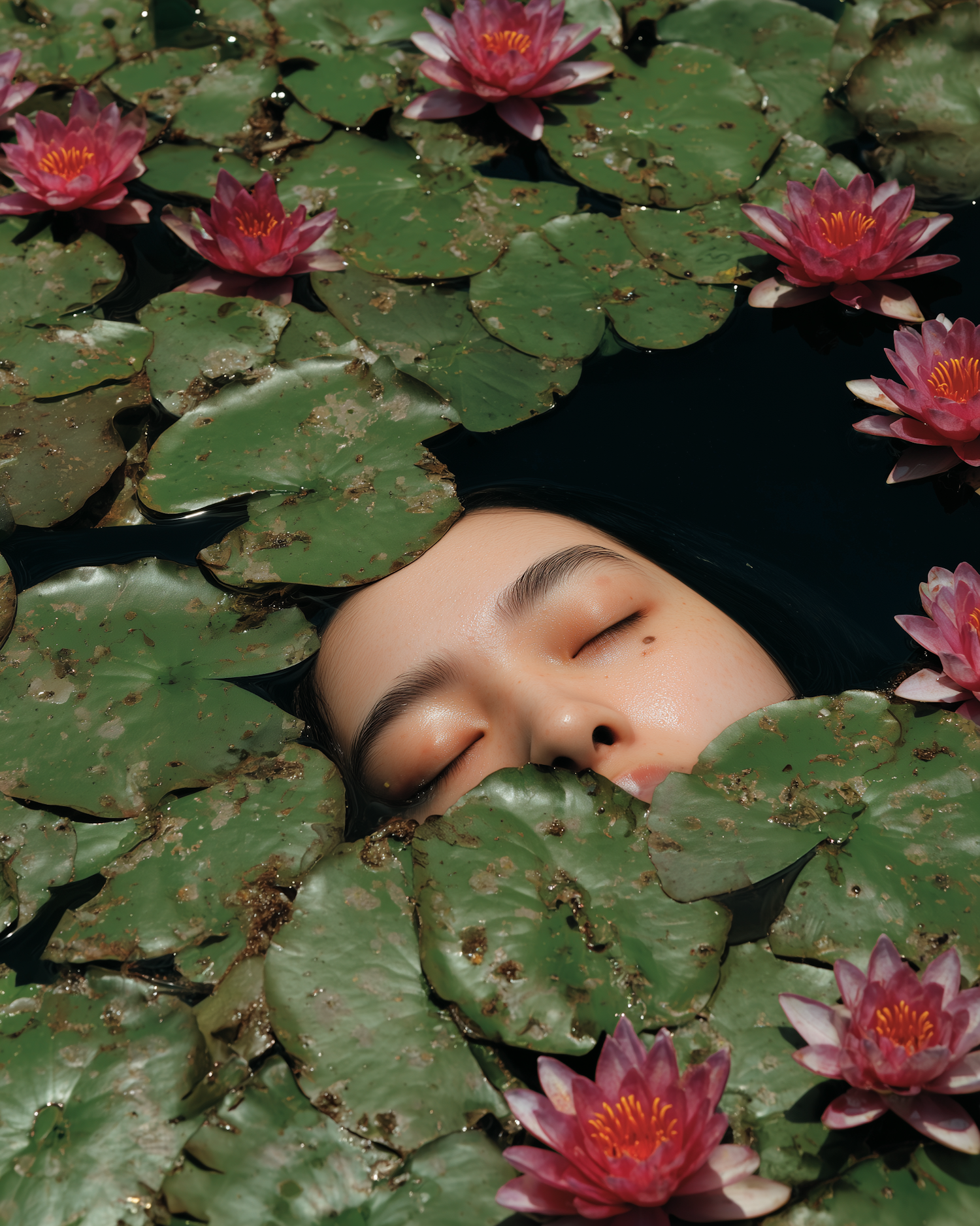 A serene face surrounded by green lily pads and vibrant pink water lilies, creating a tranquil and harmonious nature-inspired scene.