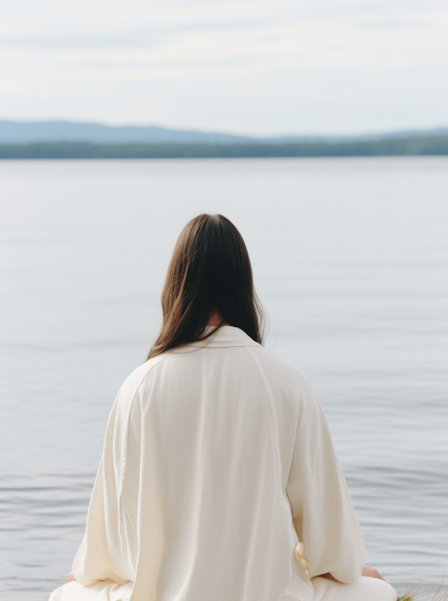 Person in a cream robe sits by a tranquil lake, facing the water, with distant hills under an overcast sky.