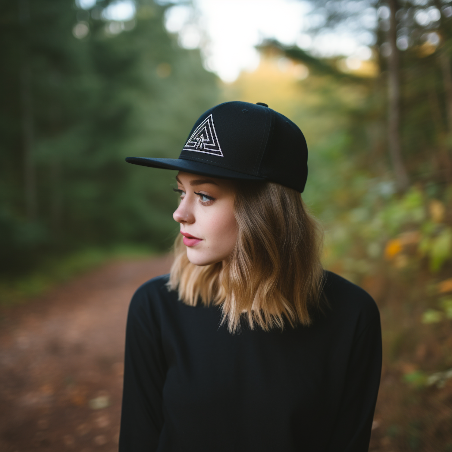 Young woman in a black cap and shirt in a forest, gazing thoughtfully to the side. Soft lighting and natural setting enhance the serene mood.