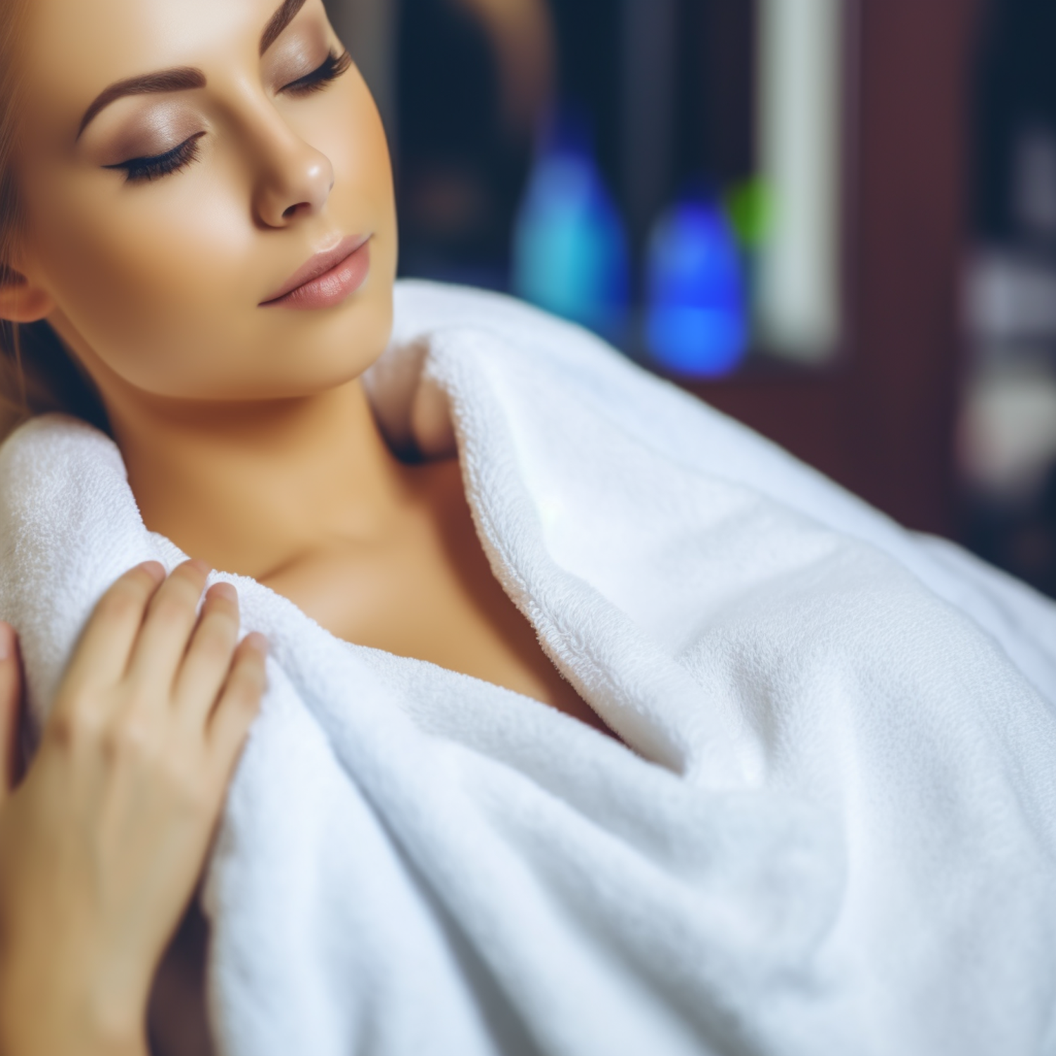 A serene woman wrapped in a white towel, eyes closed, enjoying a relaxing spa-like moment with soft, blurred background lighting.