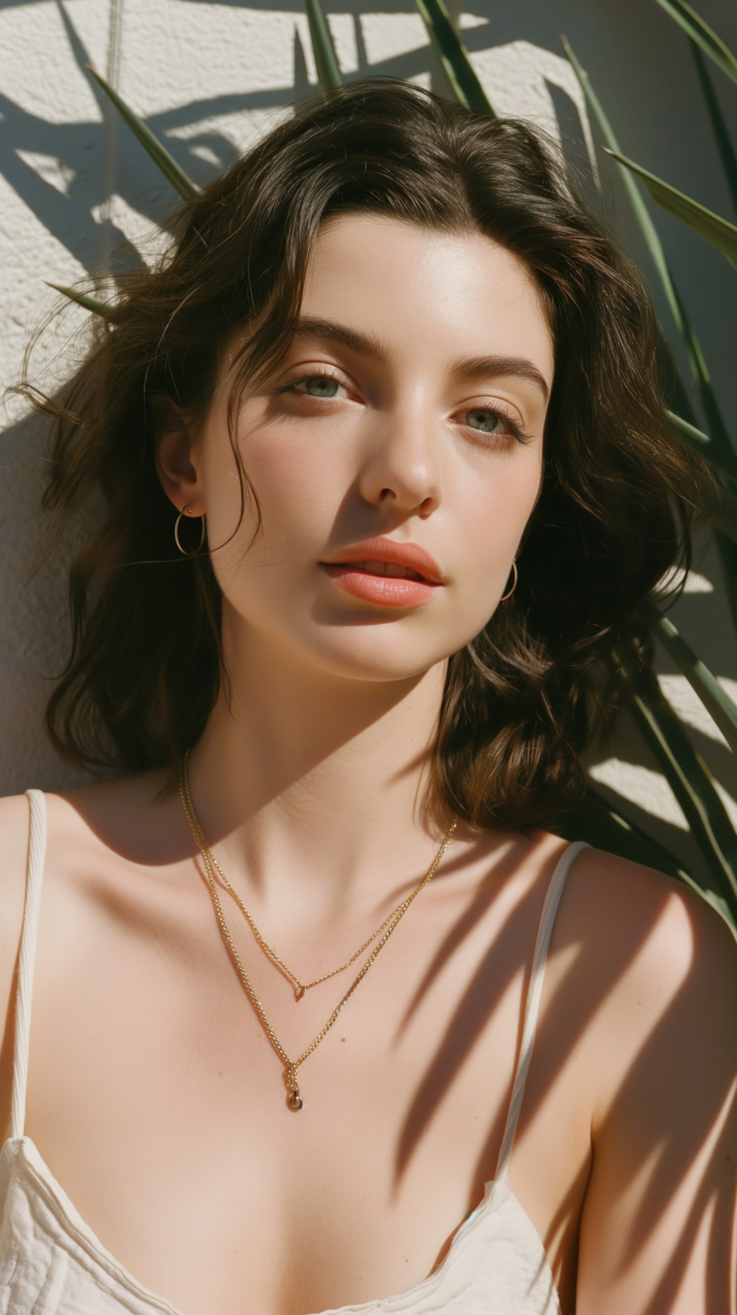 Young woman with dark hair and green eyes in sunlight, wearing gold necklaces and a white top, against a white wall with plant shadows.
