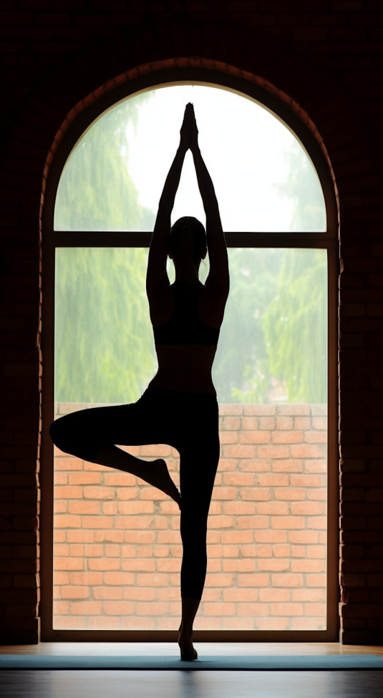 Silhouette of a person in tree pose yoga against a large arched window with brick wall background, creating a serene ambiance.