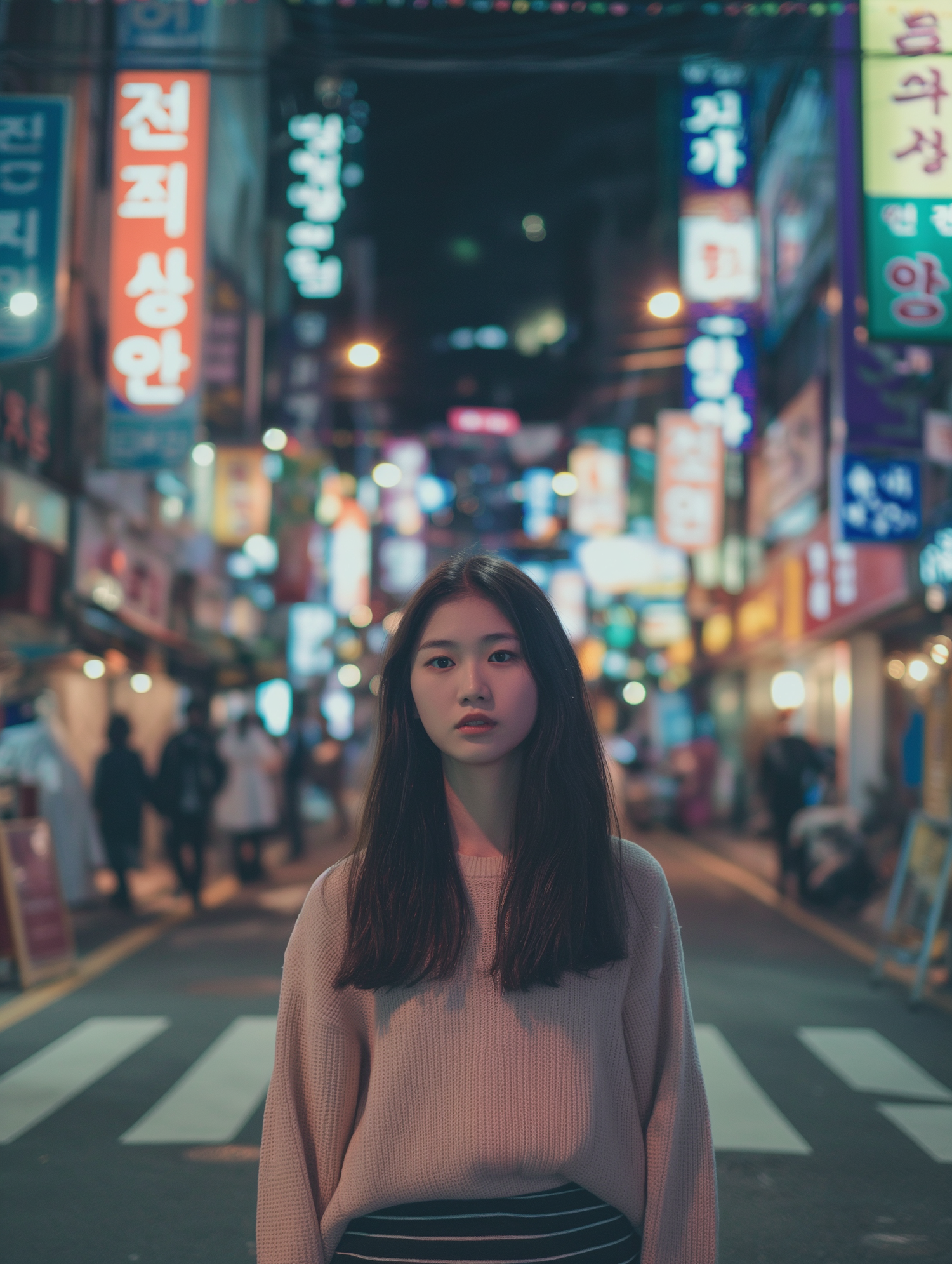 Asian woman in a bustling neon-lit street at night, wearing a light sweater and striped skirt, with vibrant signs in the background.
