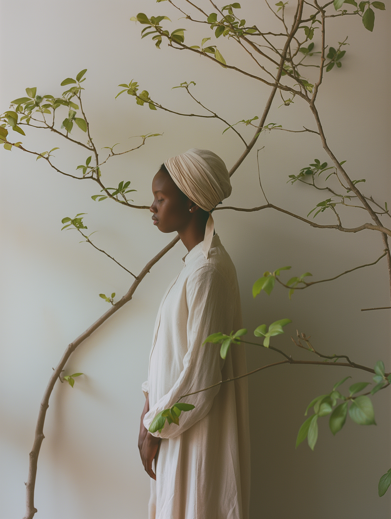 A serene portrait of a woman in a cream dress and headscarf, surrounded by delicate branches and leaves, exuding tranquility.