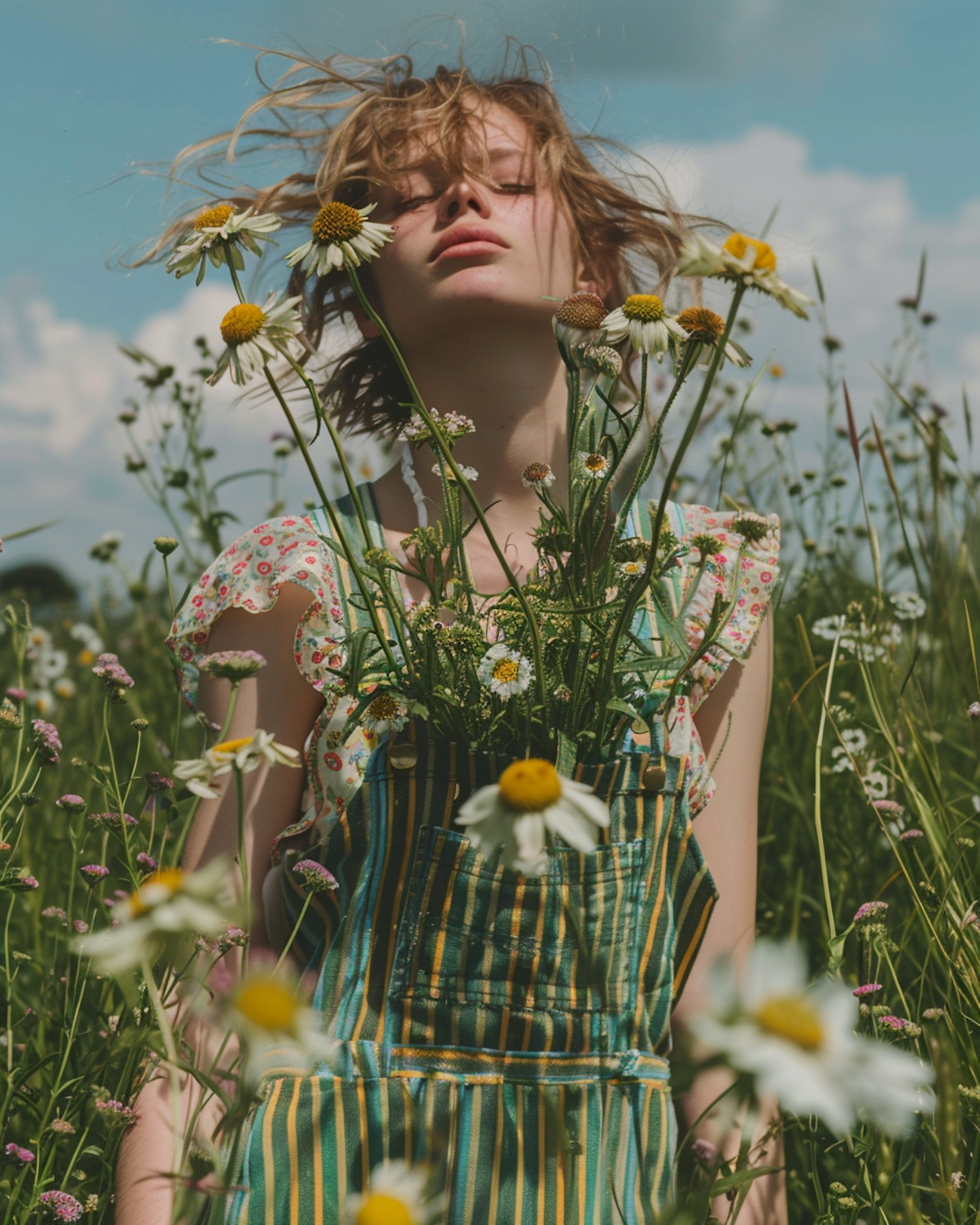 Serene woman in a field of wildflowers, wearing striped overalls and a floral blouse, with daisies in her pocket and wind-tousled hair.