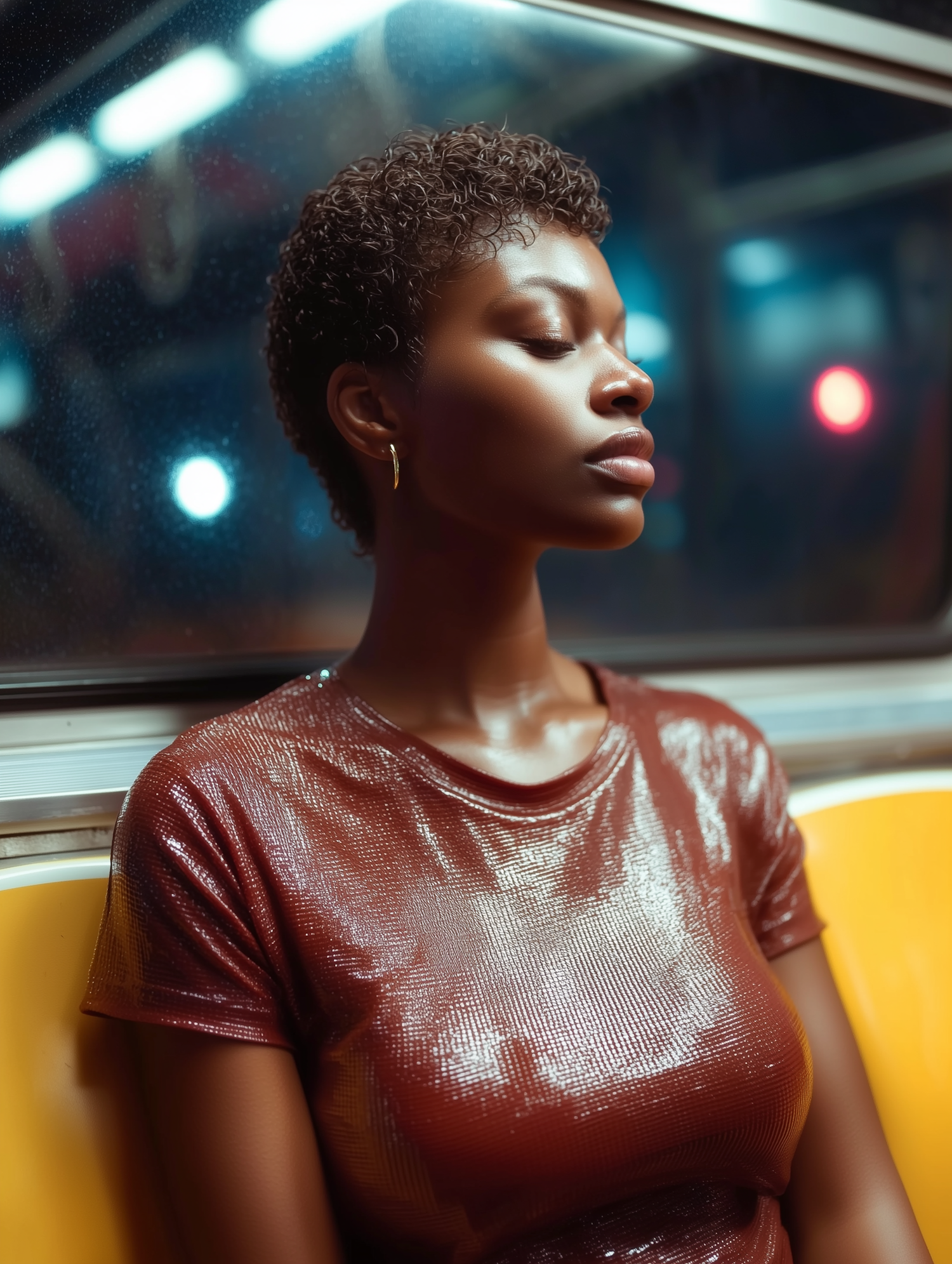 A young person seated in a subway, eyes closed, wearing a shimmering top, and bathed in warm diffused light.