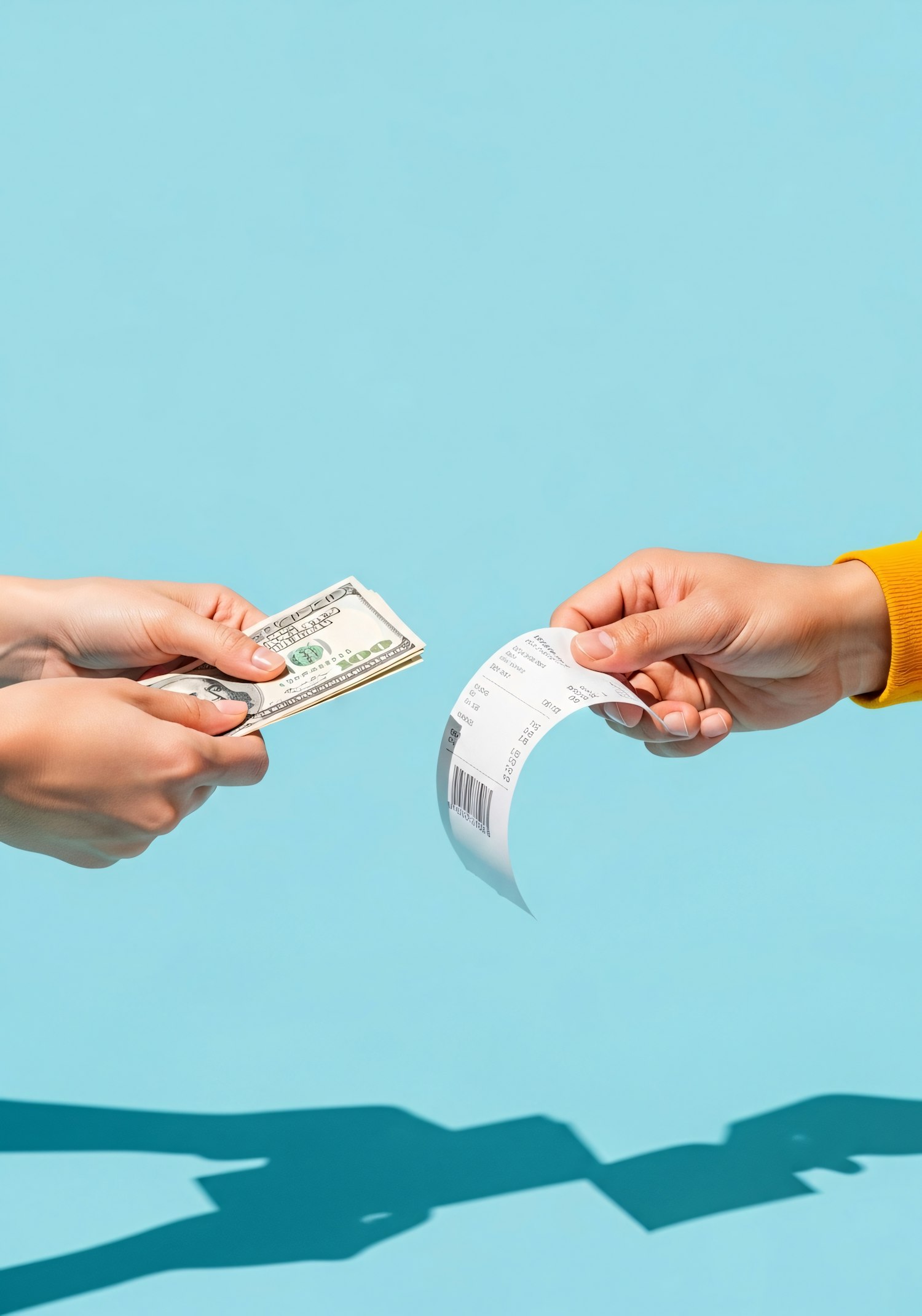 A minimalistic image of hands exchanging cash and a receipt against a light blue background, symbolizing a financial transaction.