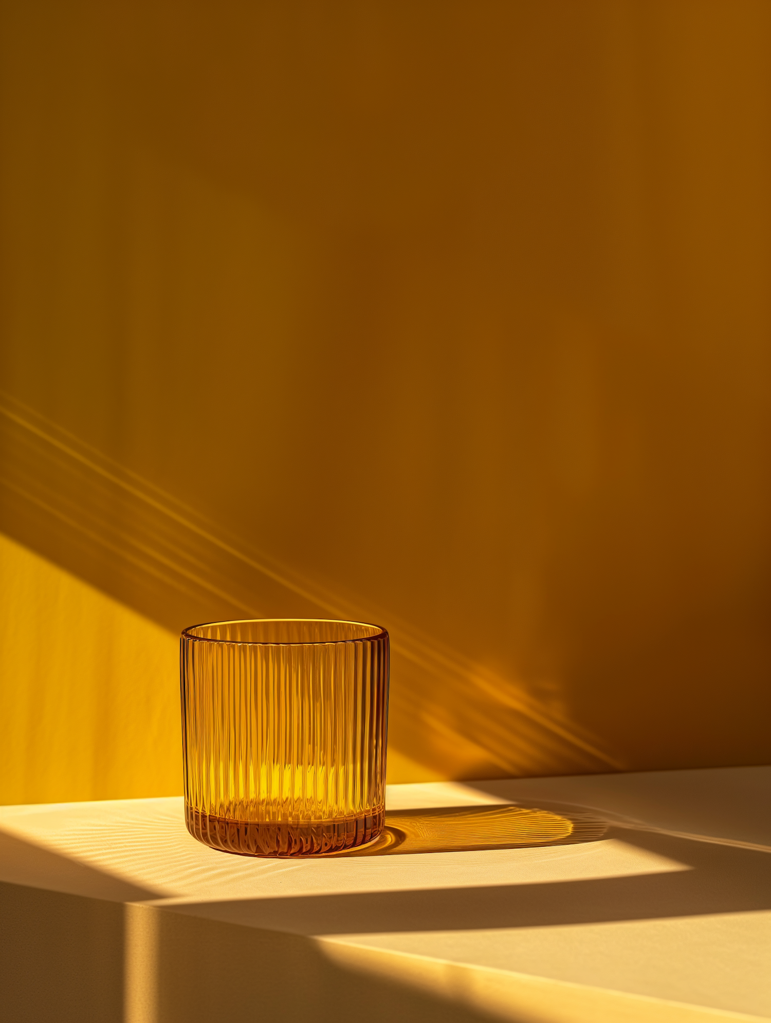 Amber ribbed glass on a yellow surface, casting a shadow in warm sunlight. Minimalistic and harmonious composition.