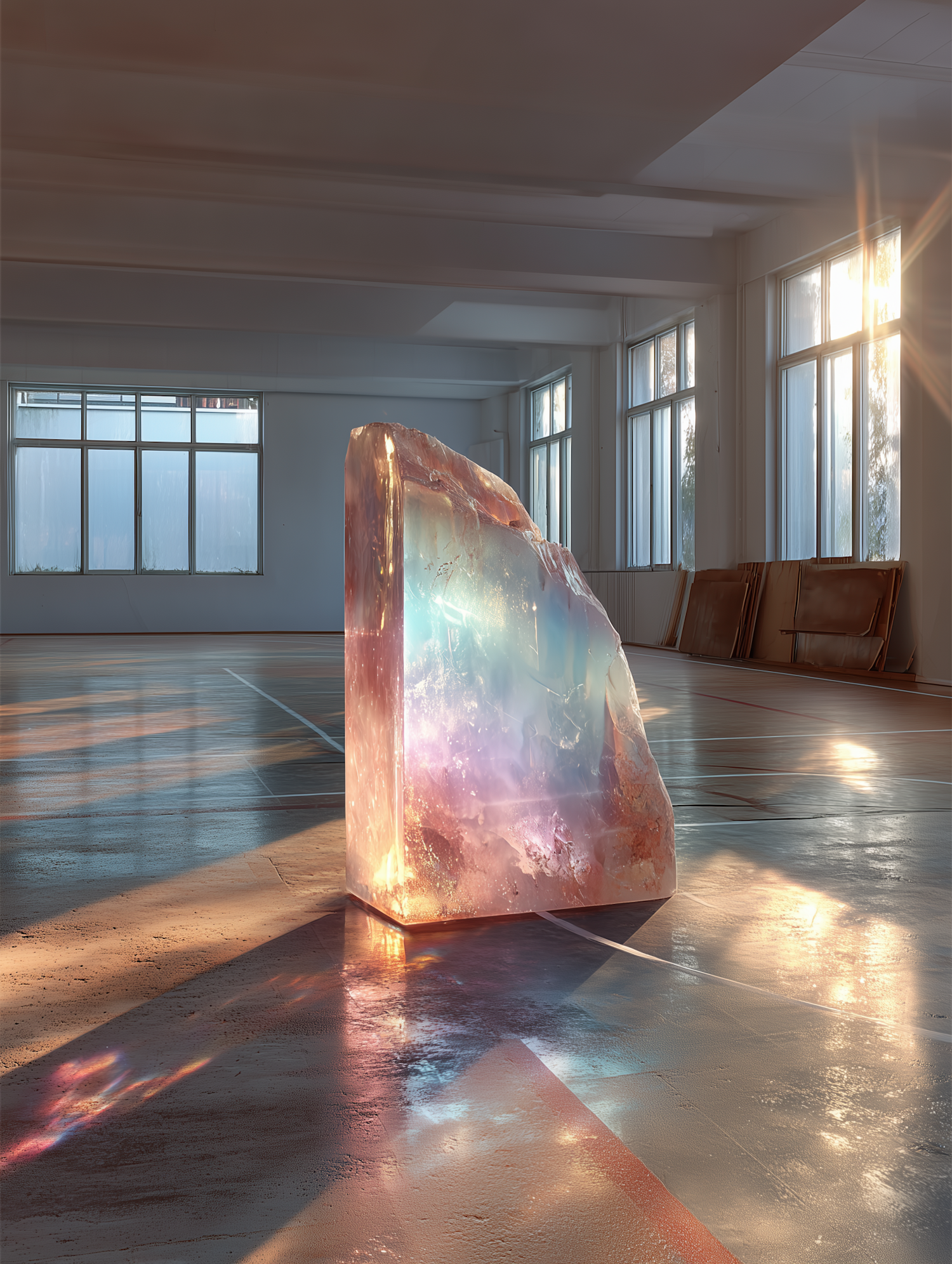 A stunning translucent crystal in a sunlit room, reflecting vibrant colors on the polished floor. A serene and captivating visual.