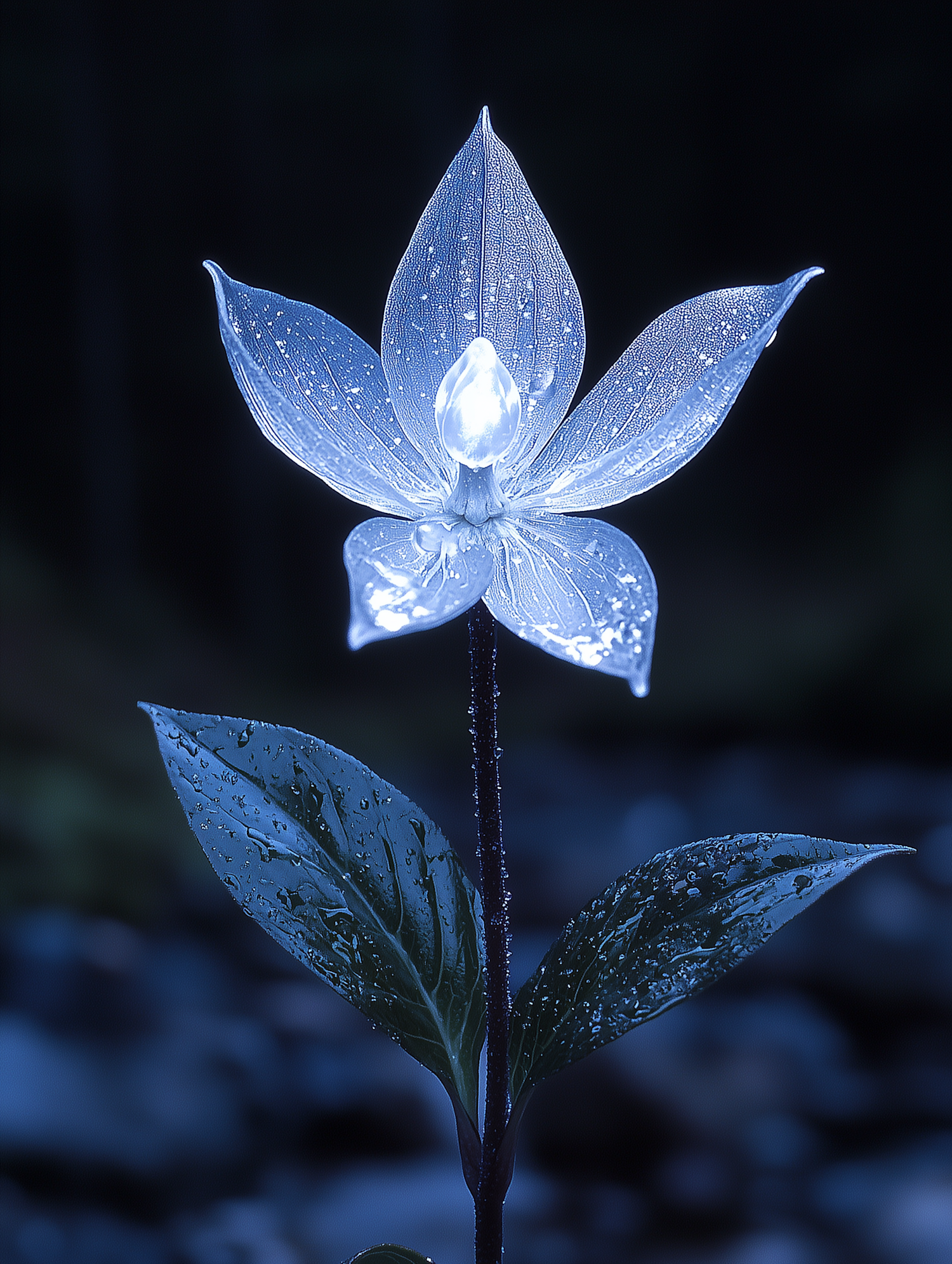 A glowing flower with dewy petals and leaves stands out against a dark background, creating a mystical and ethereal scene.