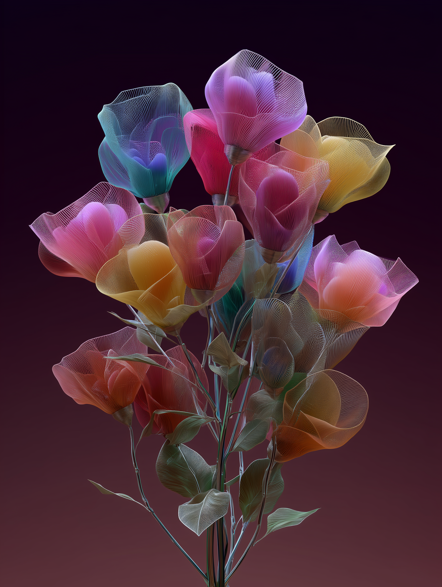 A vibrant bouquet of translucent, multicolored flowers with a mesh-like texture against a dark gradient background.