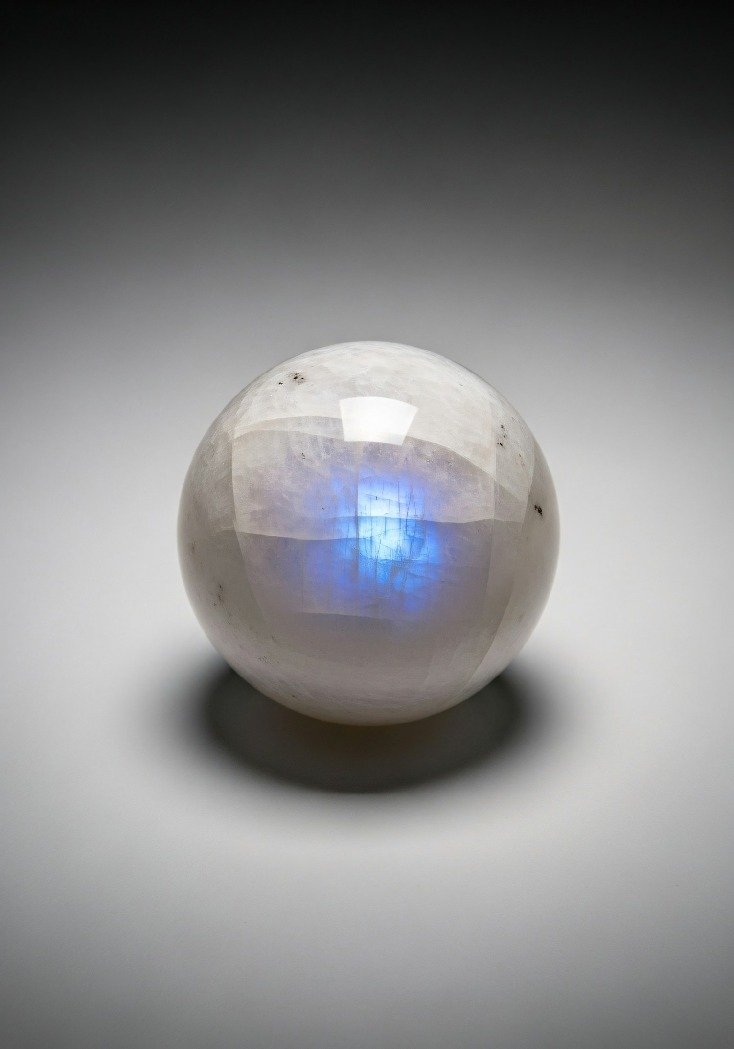 A polished gemstone sphere with a glowing blue center, set against a neutral background, showcasing its natural beauty.