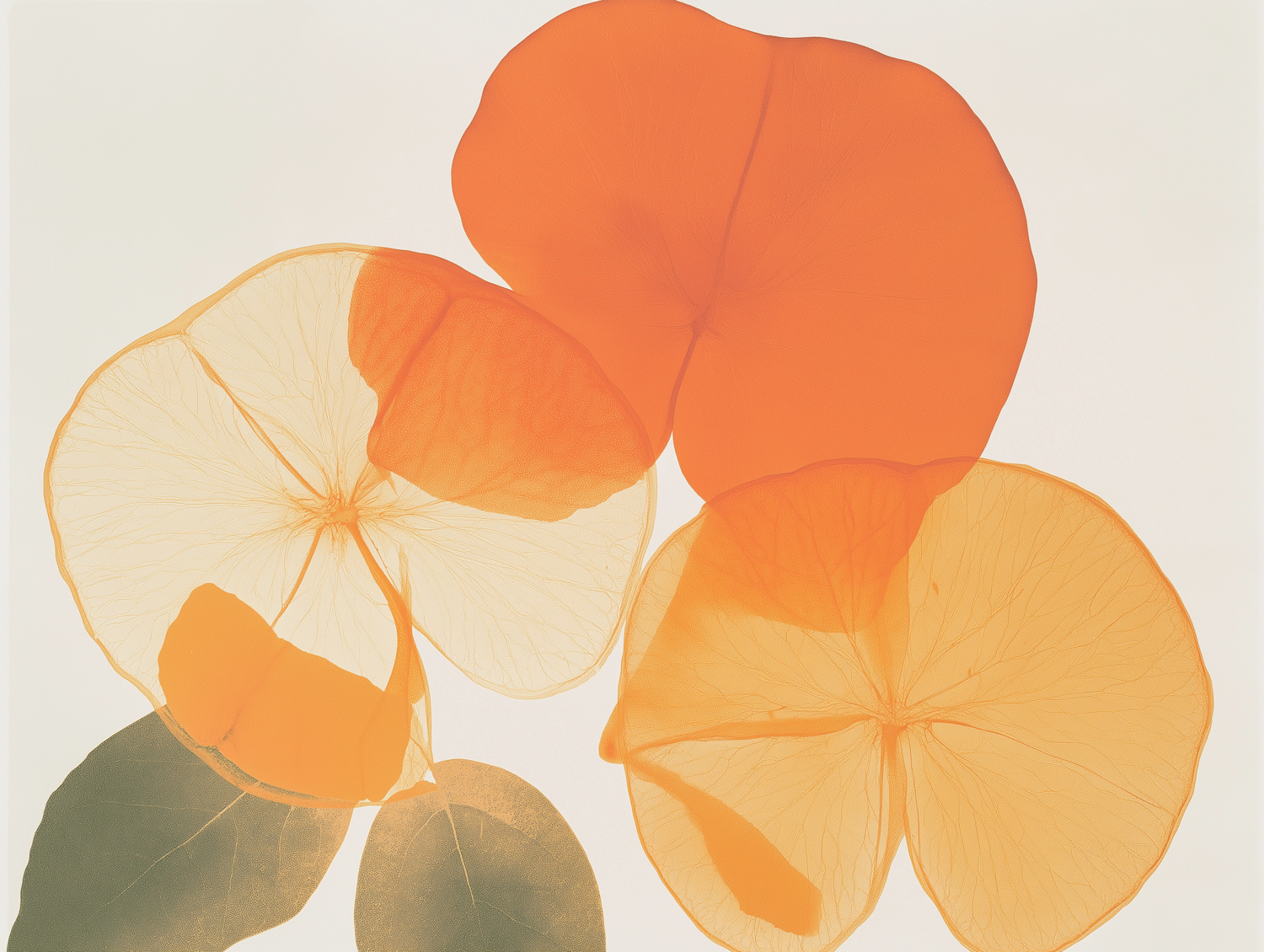 Artistic arrangement of translucent orange and yellow leaves with visible veins, creating a delicate and abstract composition.