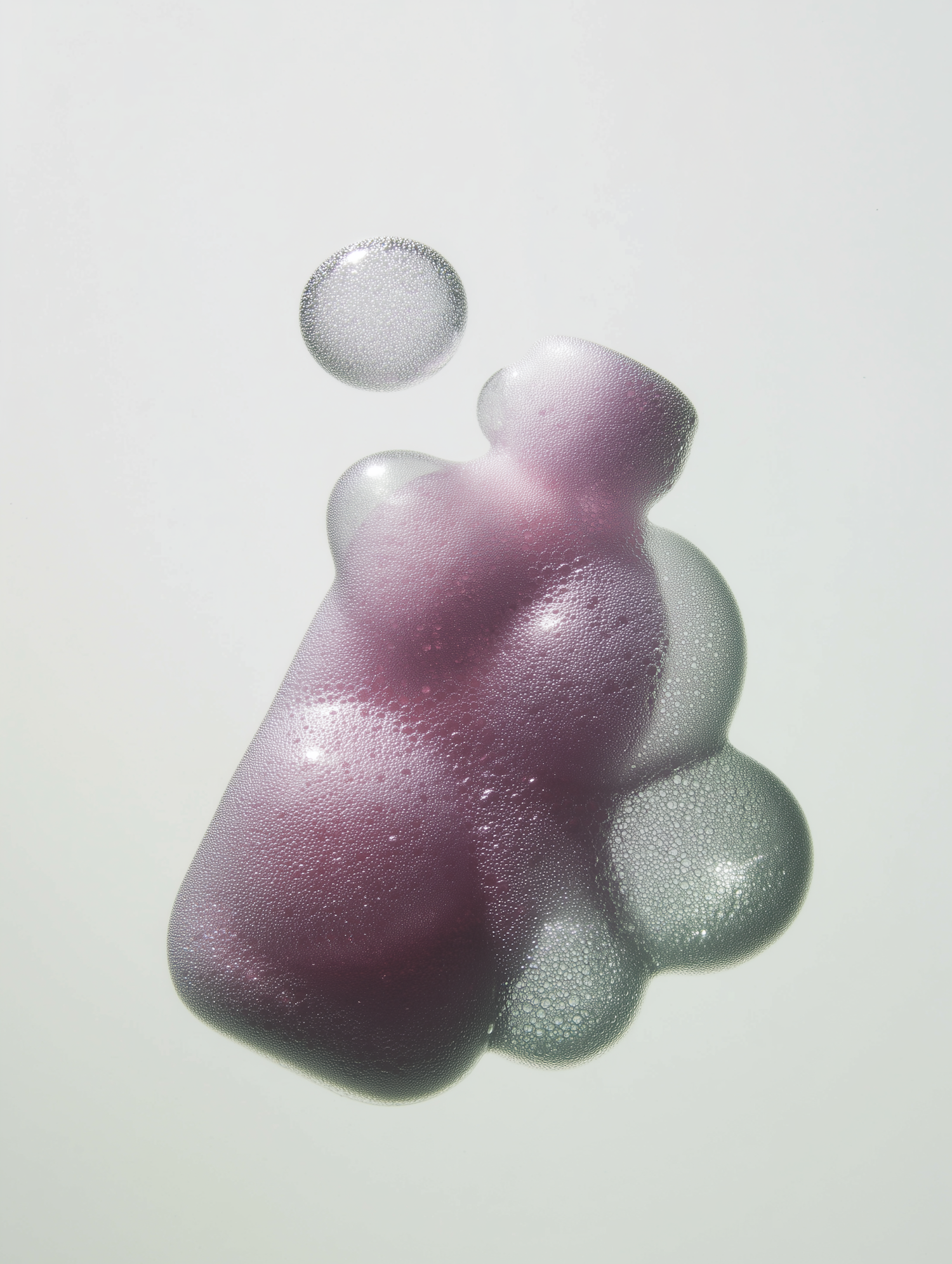 A cluster of translucent pink bubbles with a shimmering texture against a light background, creating a delicate and ethereal visual.
