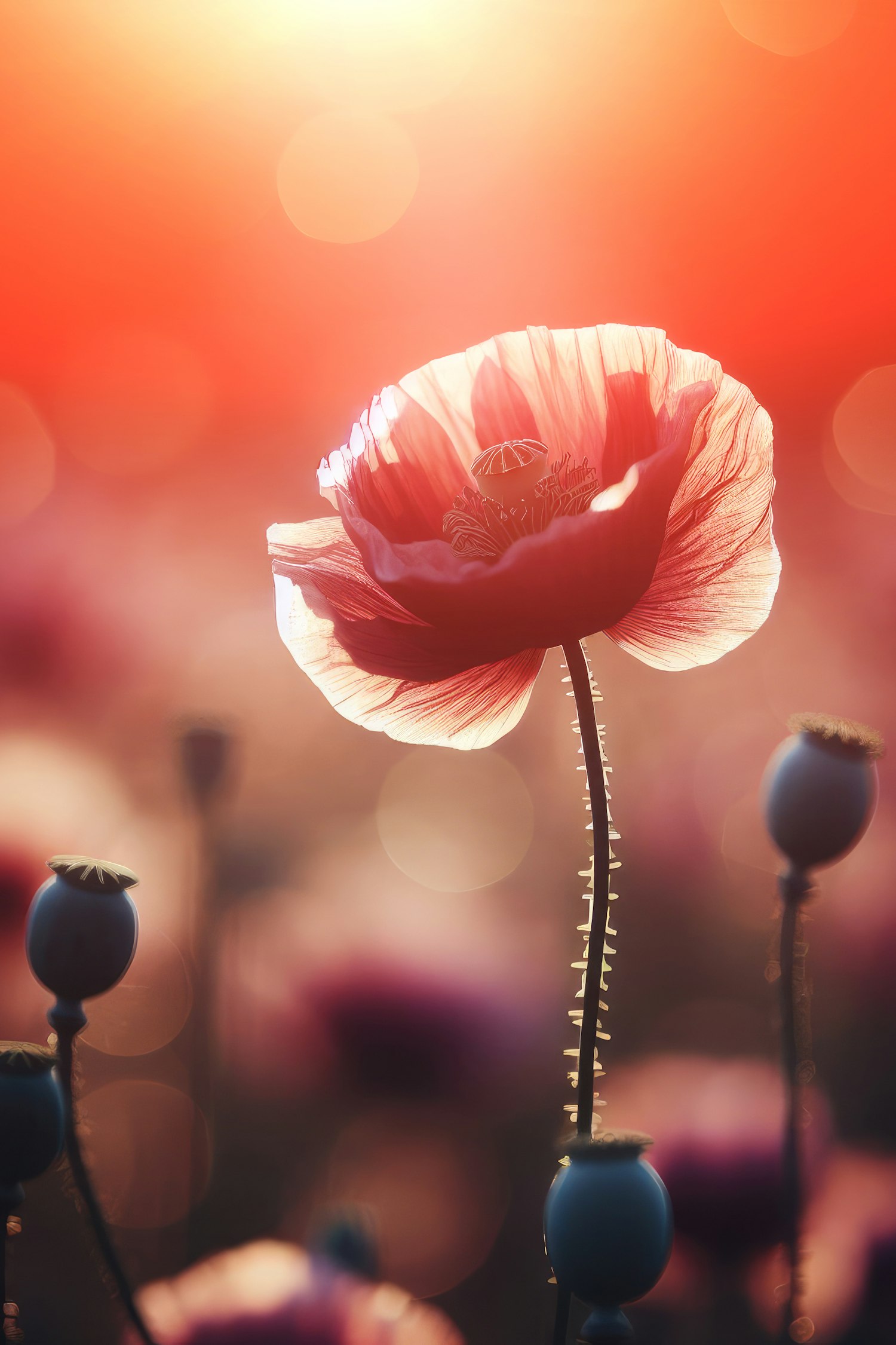 A stunning poppy flower with translucent petals glows against a warm, ethereal background, surrounded by seed pods.