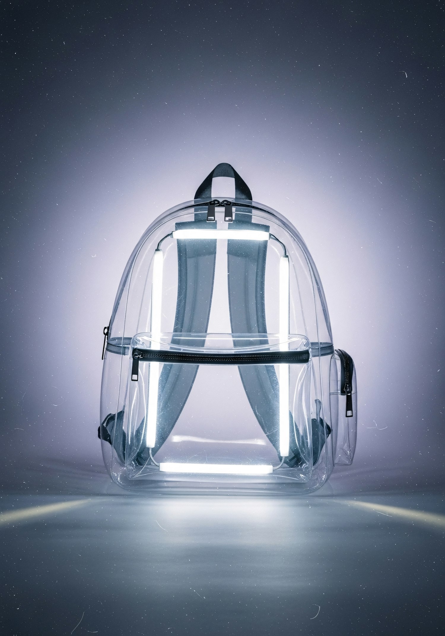 A transparent backpack with a modern design, highlighted by soft lighting against a gradient background, showcasing its sleek and futuristic style.