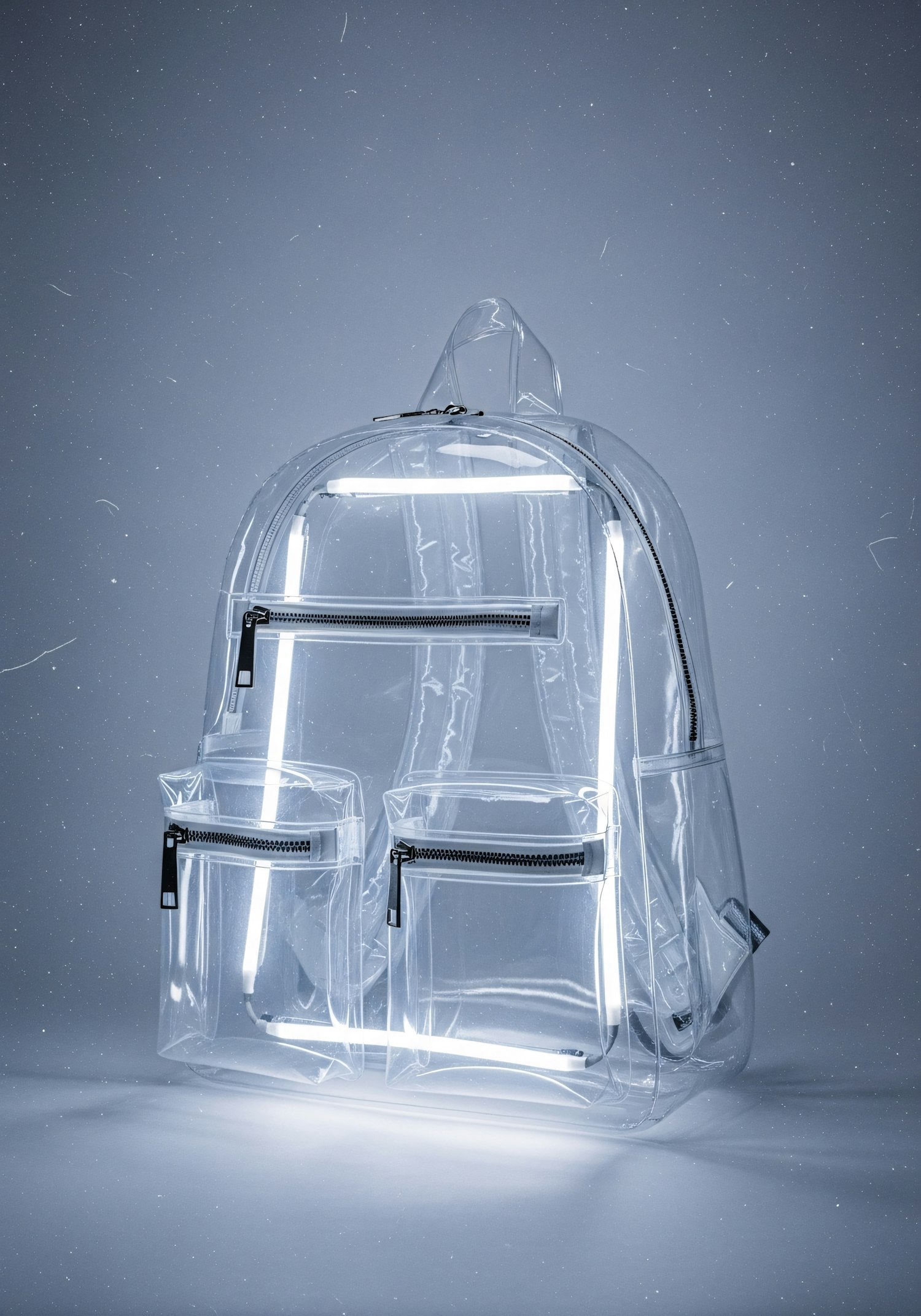 A sleek transparent backpack with multiple compartments, showcasing a modern and minimalistic design against a neutral background.