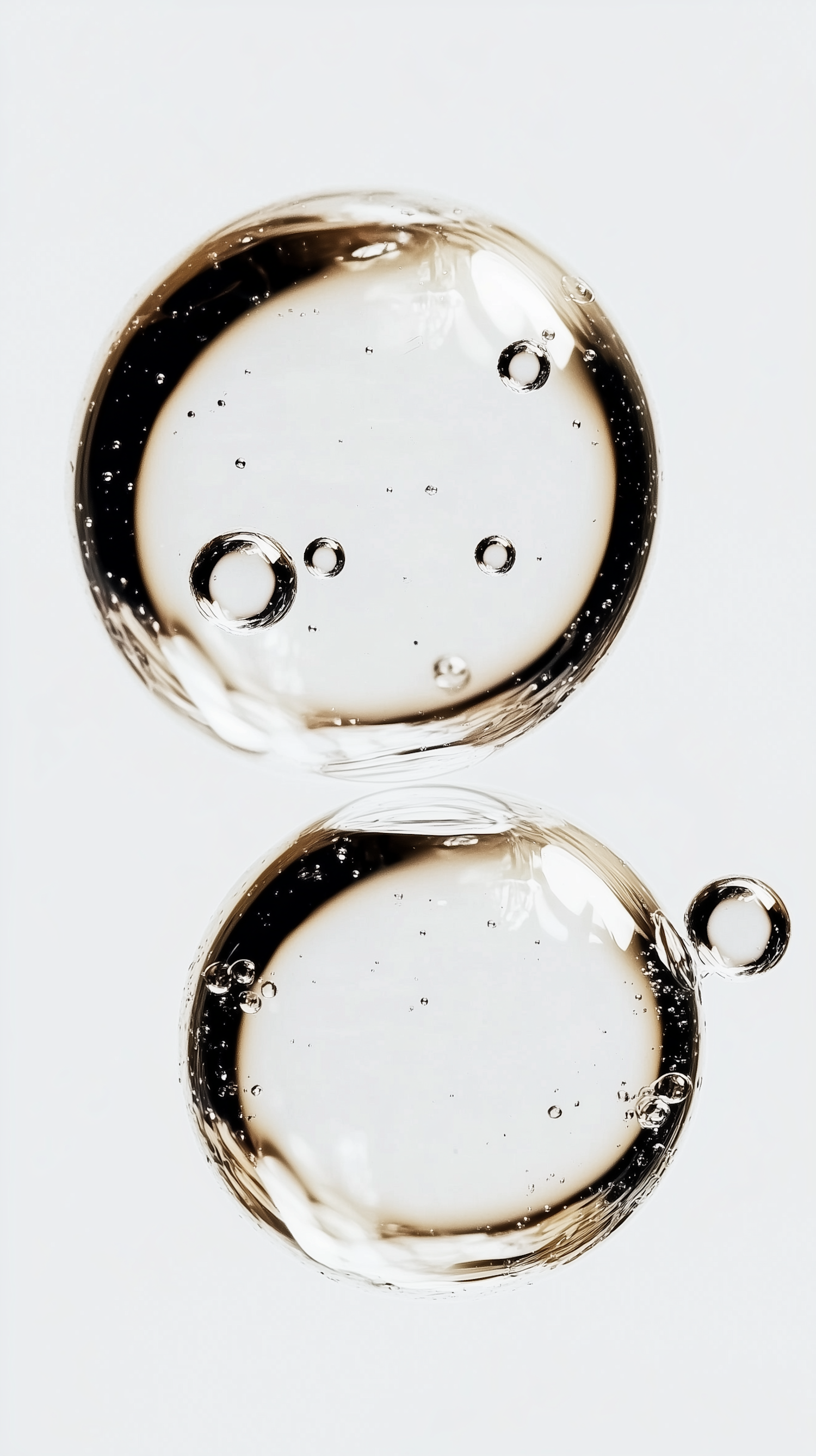 Close-up of two transparent bubbles with smaller air bubbles inside, set against a clean white background. Minimalist and elegant.