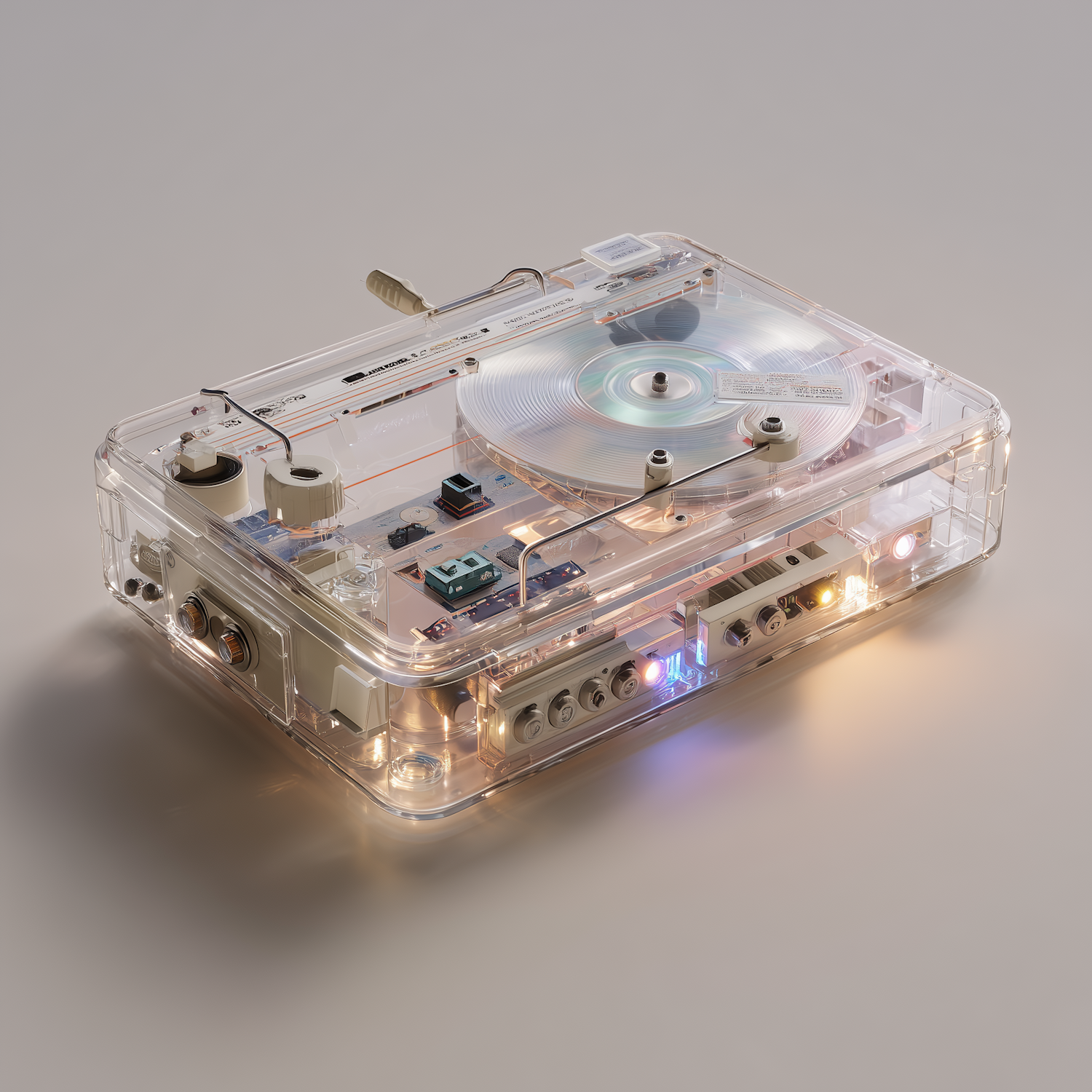 Transparent cassette player showcasing intricate internal components and glowing lights, blending retro design with modern aesthetics.