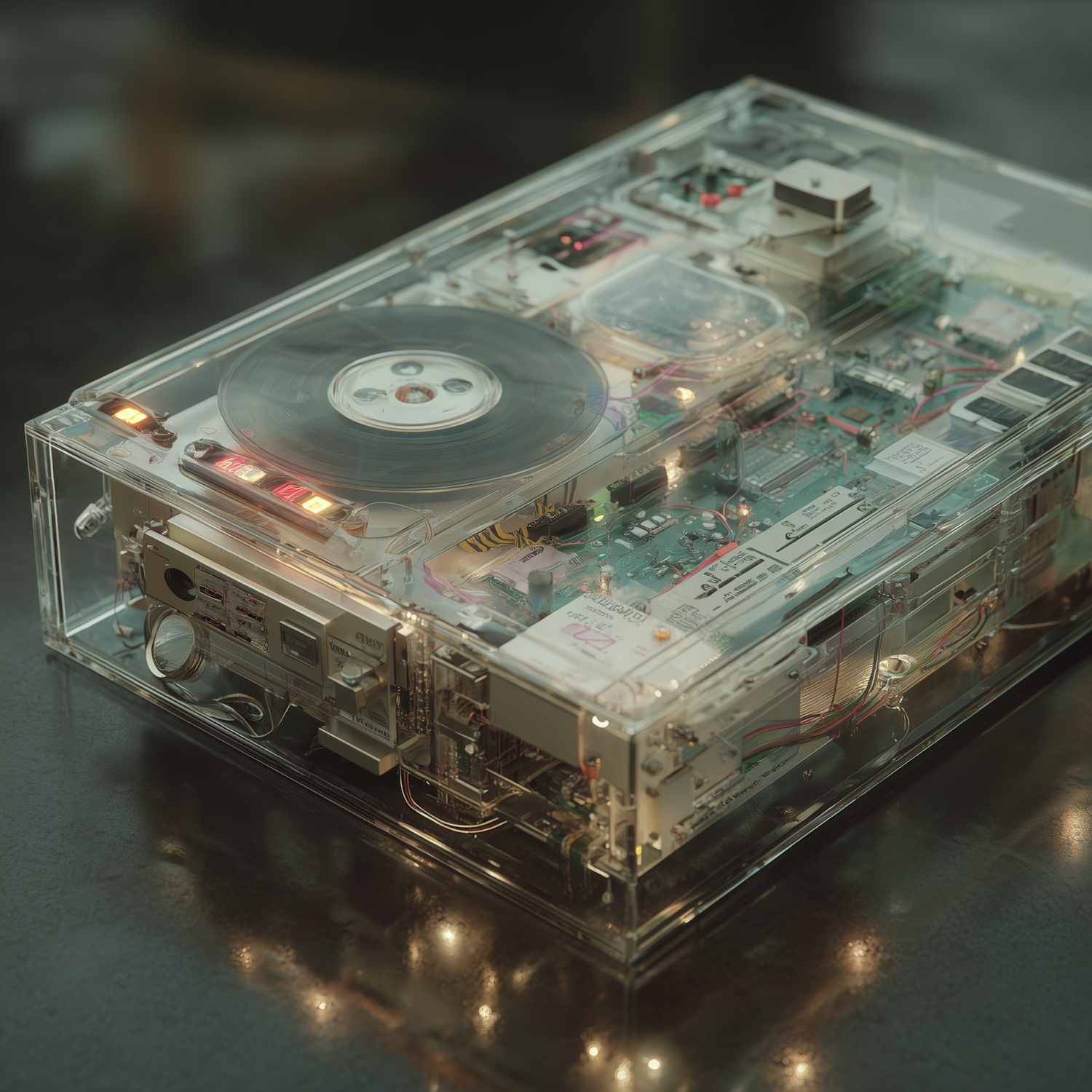 Transparent cassette player showcasing intricate internal components and a spinning tape reel, illuminated by LED lights.