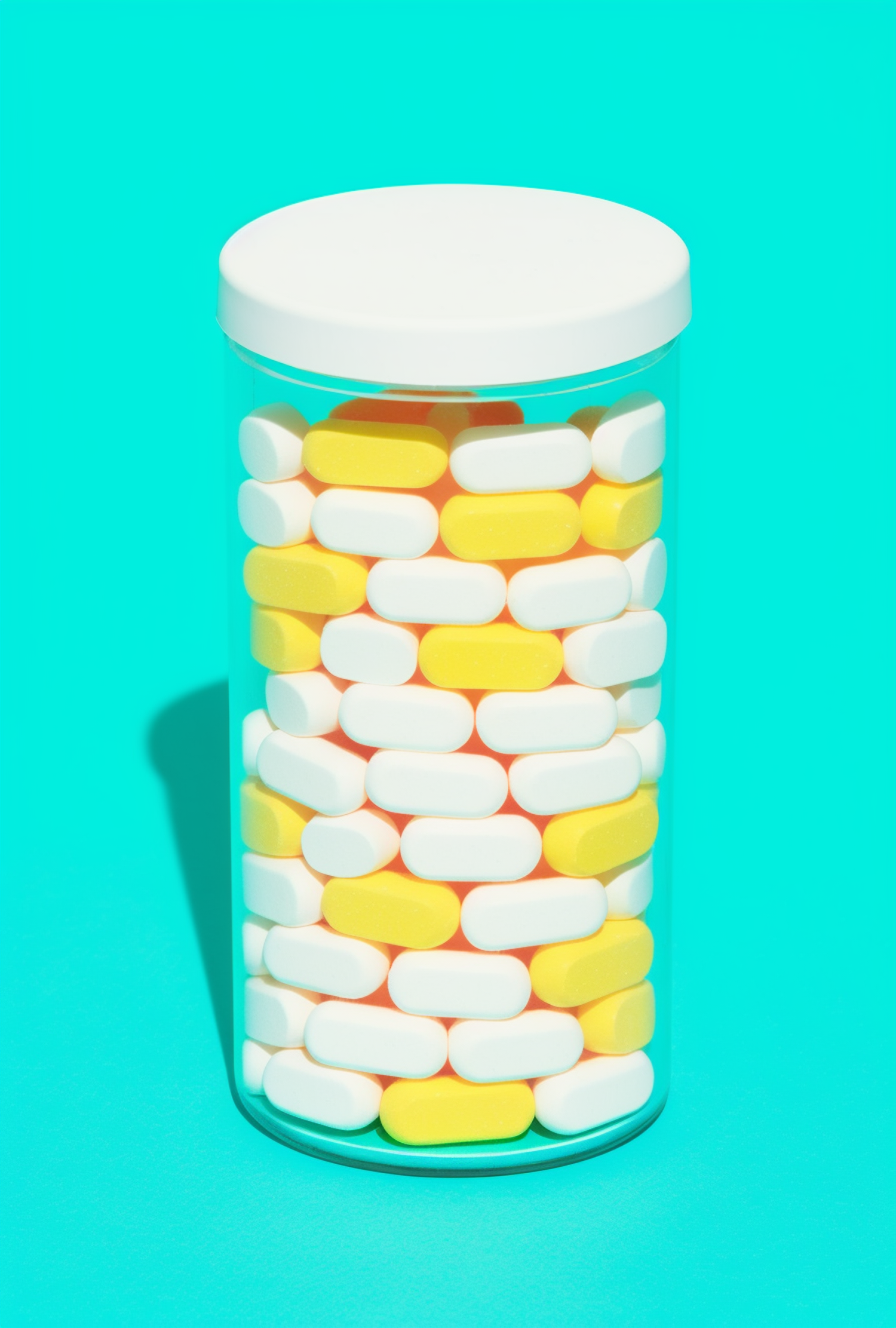 Clear container with yellow and white pills against a turquoise background, creating a vibrant and modern visual contrast.