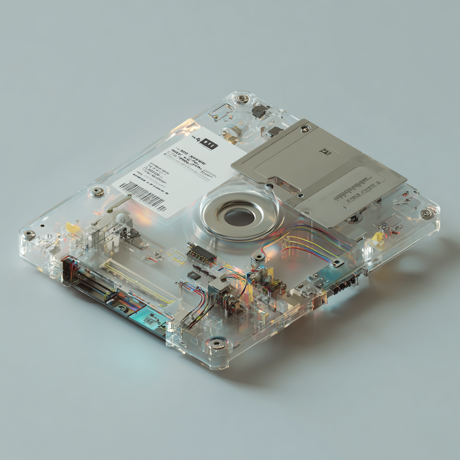 Transparent electronic device revealing internal components and wiring, showcasing intricate design and technology.