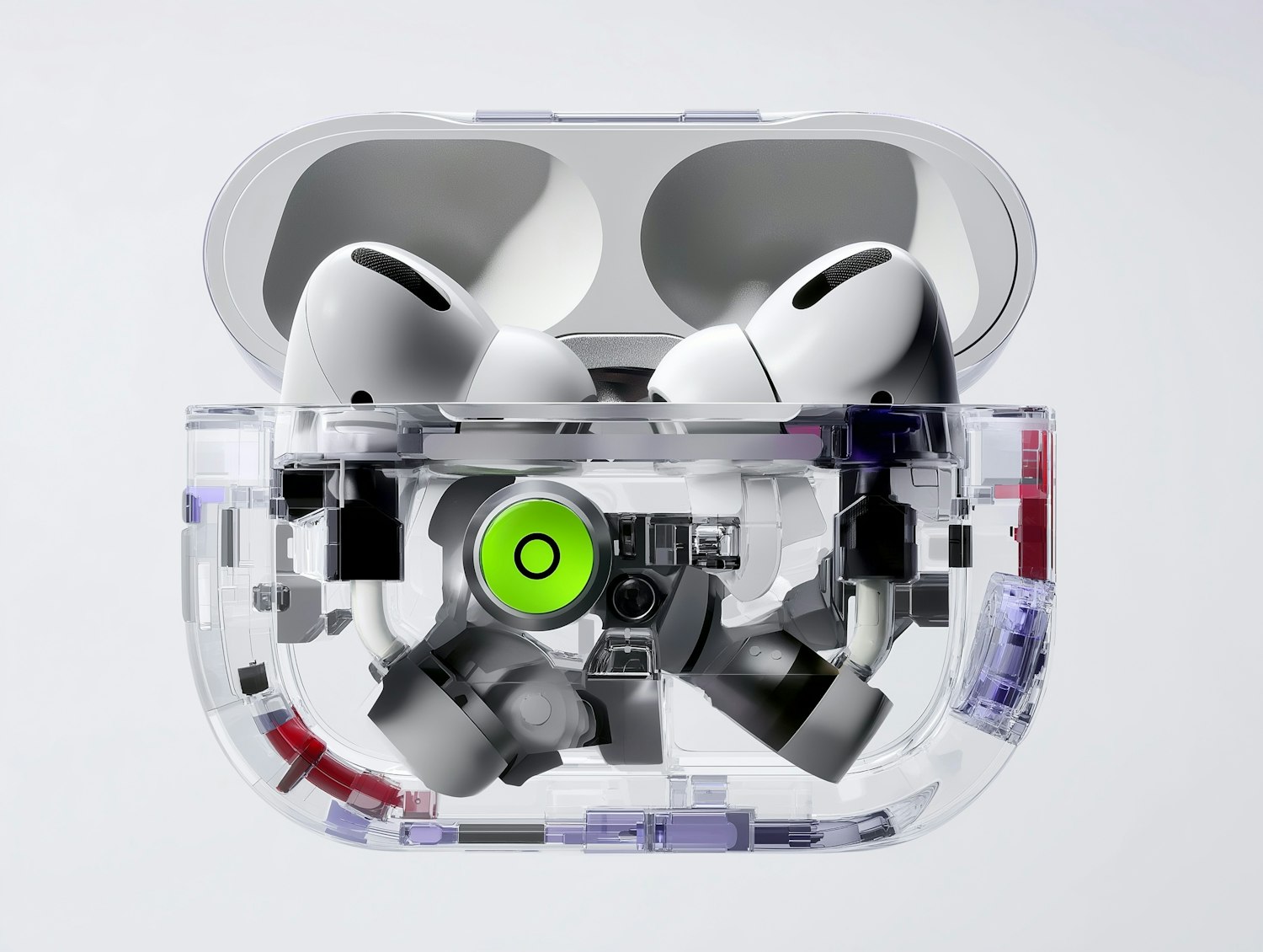 Transparent wireless earbuds case revealing intricate internal components, paired with sleek white earbuds. Modern and innovative design.