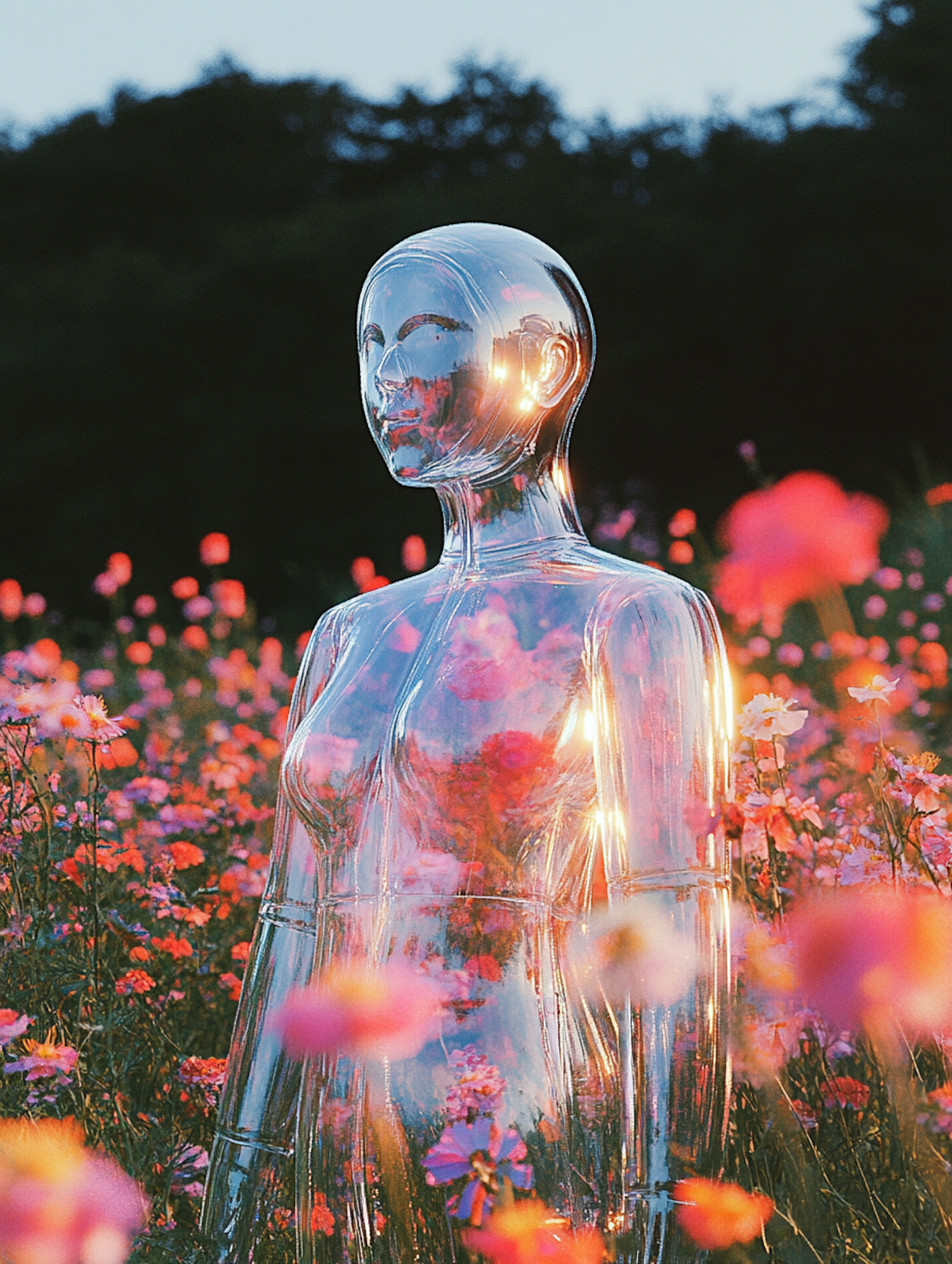 A transparent humanoid figure in a field of vibrant flowers, reflecting the warm glow of the setting sun. Futuristic and serene.