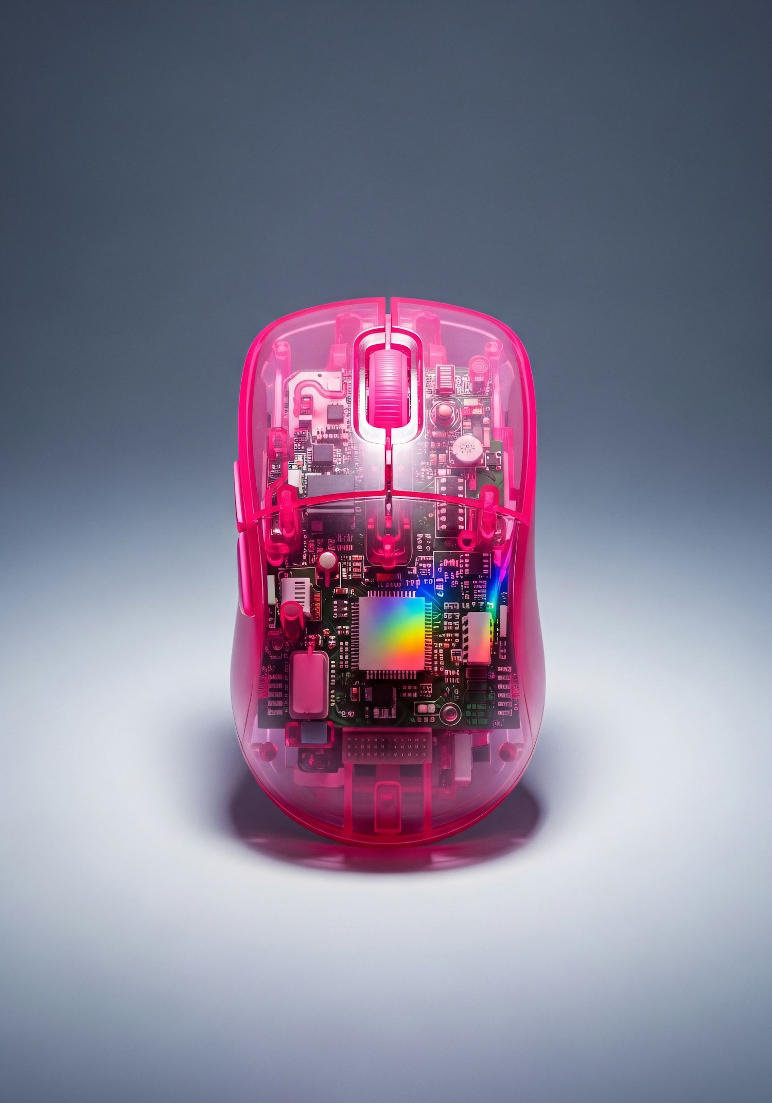 A transparent pink computer mouse showcasing its internal circuitry, set against a gradient background for a modern tech aesthetic.