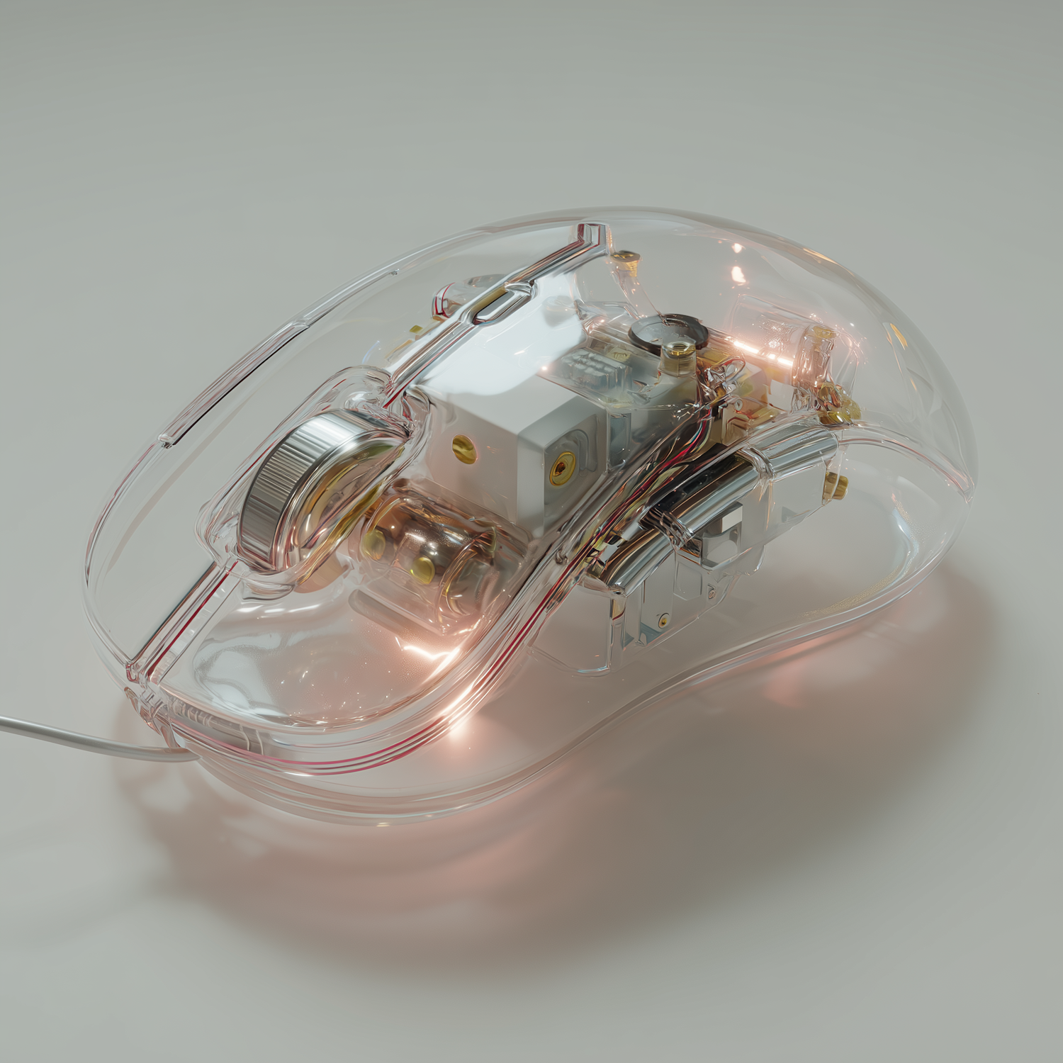 Transparent computer mouse showcasing intricate internal components and LED lighting, perfect for tech enthusiasts and modern setups.