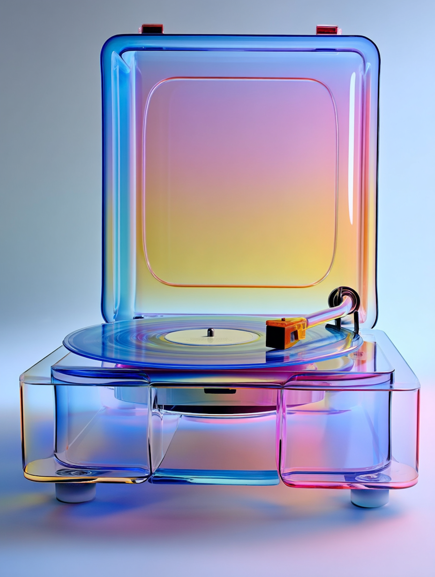 Translucent record player with rainbow gradient illumination, blending retro aesthetics with modern transparent design.